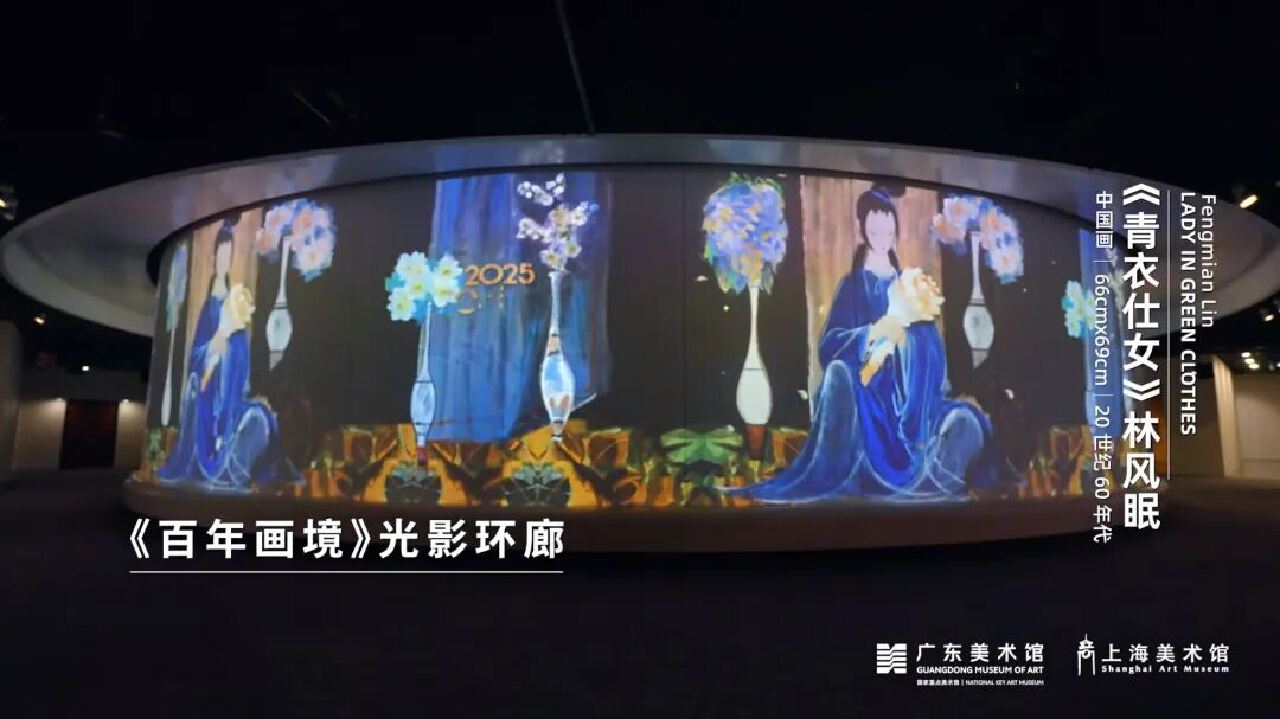 行走在圆形的“百年画境”光影环廊,林风眠笔下的《青衣仕女》正手捧花束,低头轻触,而郑爽描绘下的《黑牡丹、白牡丹》也仿佛拥有了生命般在屏幕光影中迎风绽放。