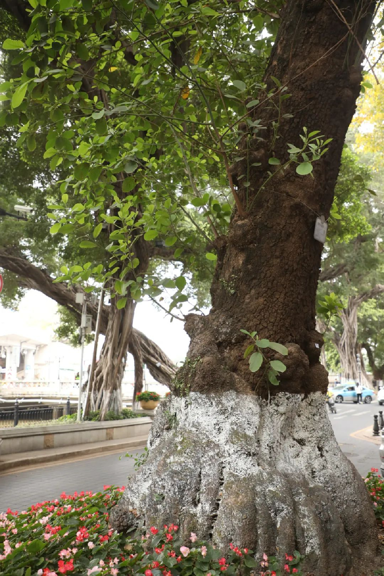 沙面南街1號“白天鵝賓館”側門前的榕樹(細葉榕),編號44010300110100002,樹齡235年。細葉榕是桑科榕樹屬,常綠喬木,在南方地區廣泛栽植。榕樹枝幹上有很多氣生根懸垂,能形成獨木成林的景觀,榕樹不懼烈日暴曬,是比較好的遮陰樹種。