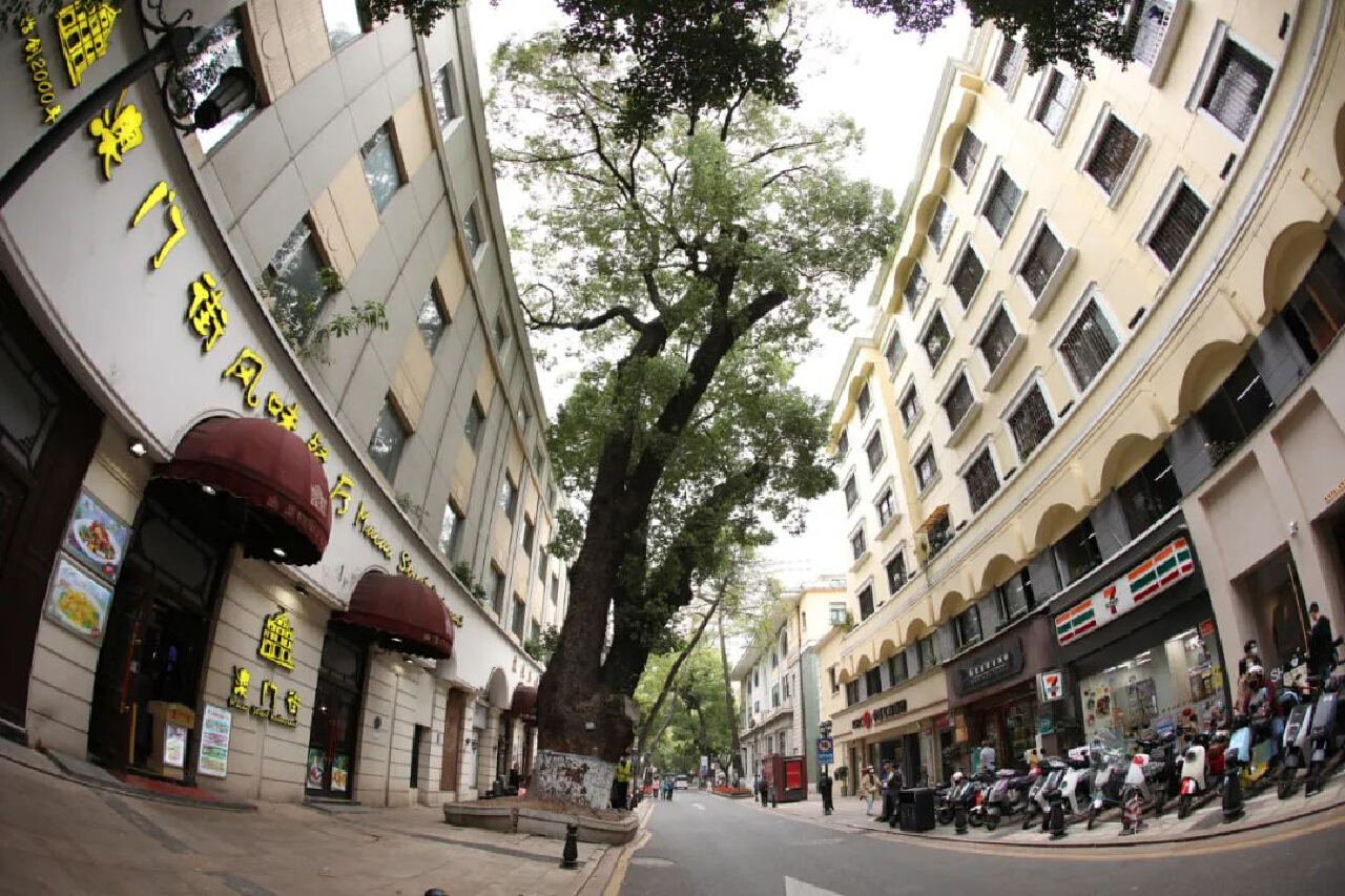 △ 沙面大街54號“澳門街”門前的樟樹,編號44010300110100101,樹齡338年。 圖/Color China