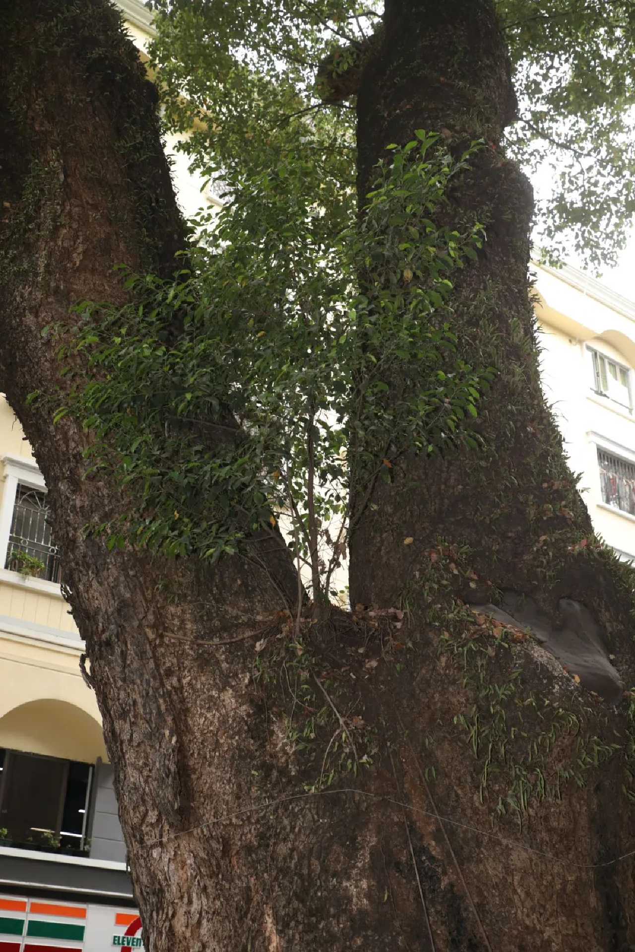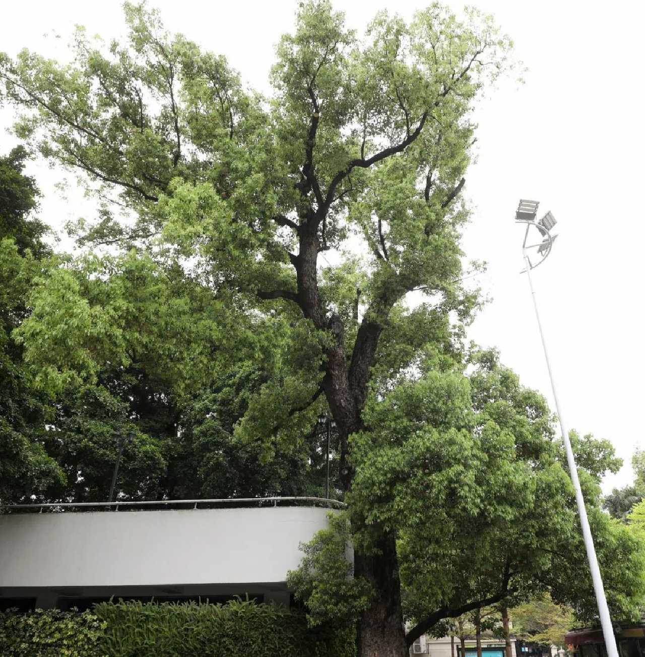 沙面大街1號“貓屎咖啡”門前的假柿木姜子,編號44010300110100079,樹齡165年。假柿木姜子,是樟科,木姜子屬常綠喬木,傘形花序;樹姿優美,適宜作為庭院樹;鳥類喜食其果,也可用作招鳥樹木。木材可用作傢俱等,種仁脂肪油含量較高,也可提取粘膠。
