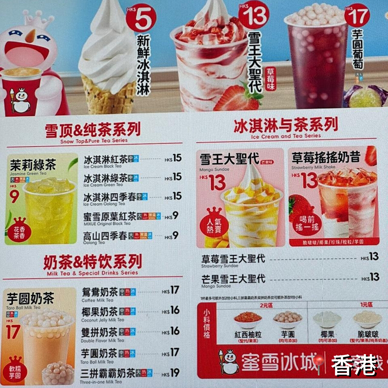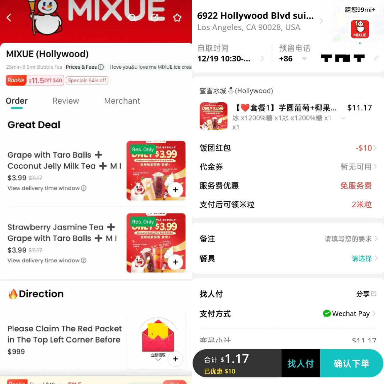 一直以高性價比著稱的蜜雪冰城,在美國市場延續親民定位。外賣APP顯示,美國首店推出兩款限時預售套餐,包含兩杯飲品及一個冰淇淋,優惠價均為3.99美元(約31港元),新客最低只需1.17美元(約9.1港元),而原價則為11.17美元(約87港元)。