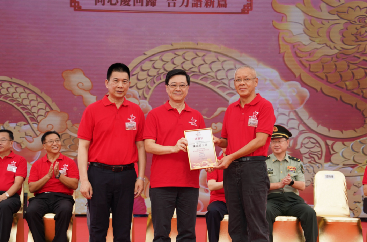 行政長官李家超(中)、 慶委會主席譚錦球(左一)向慶委會籌委會主席陳鴻道(右一)頒發感謝狀