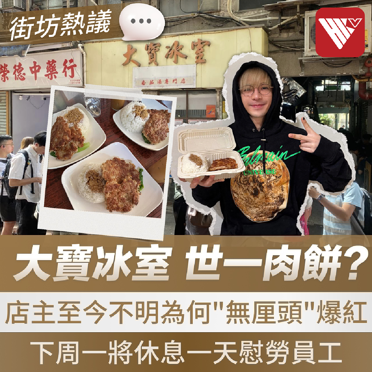 元朗大寶冰室的肉餅飯近日成為網絡熱話,更有網民盛讚其為“全亞洲最優秀的肉餅飯”。近兩日,冰室門外出現超長人龍,隊伍更延伸至青山公路。店主女兒的朋友於網上代為發聲,表示店主雖然忙碌卻感欣喜,但全家至今仍未明為何突然“無厘頭”爆紅。