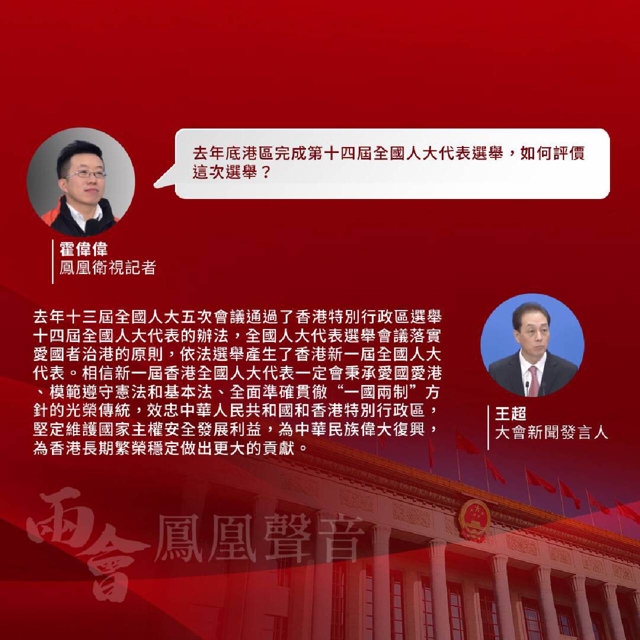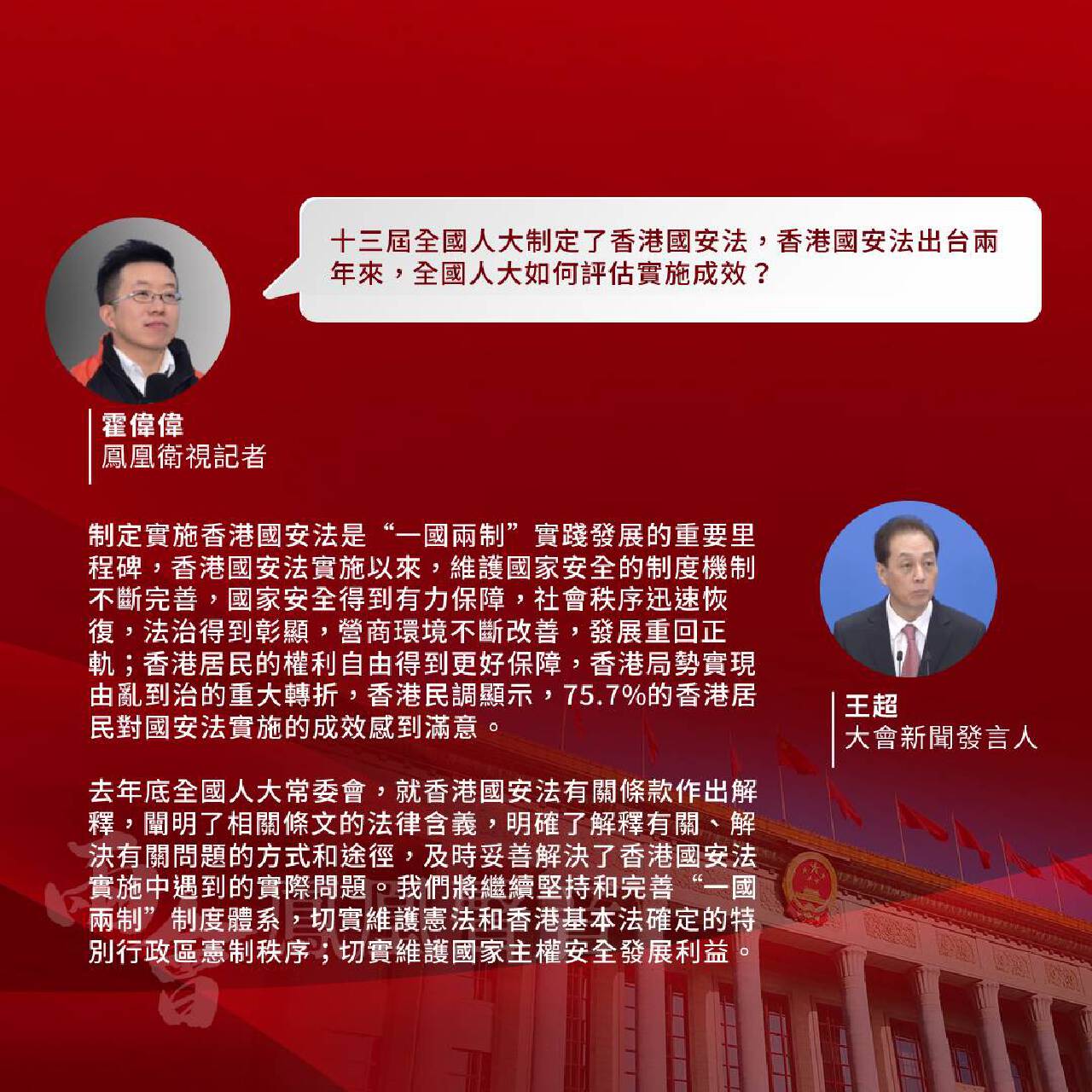 鳳凰衛視記者霍偉偉:十三屆全國人大制定了香港國安法。香港國安法出台兩年來,全國人大如何評估實施成效?去年底港區完成第十四屆全國人大代表選舉,如何評價這次選舉?