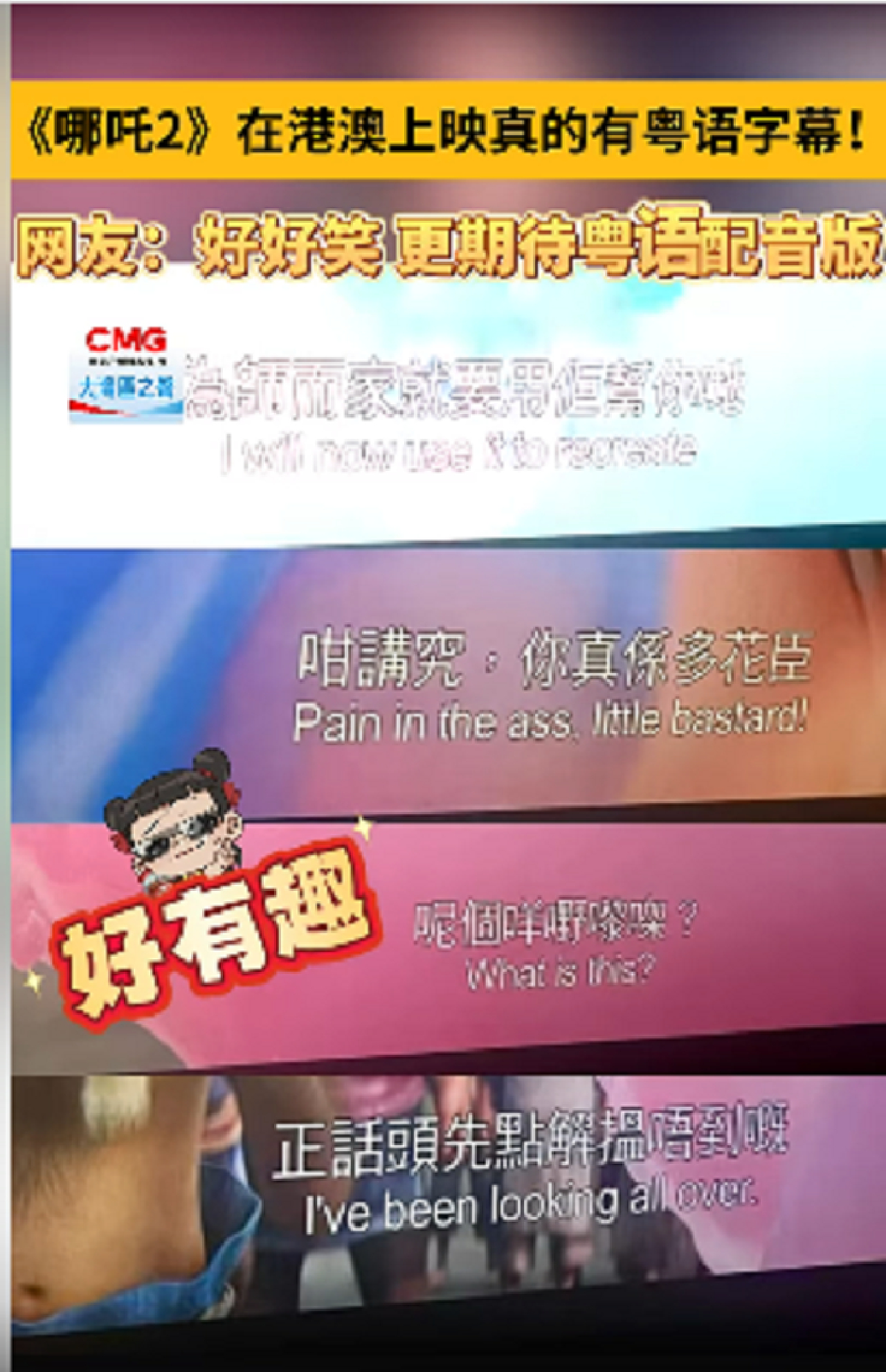短视频“新闻女狂第9集”说:哪吒2香港首映,配音普通话,字幕繁体广东话,咁都得(这都行)?“这个搭配有点怪”。