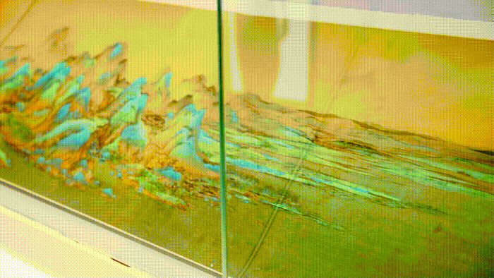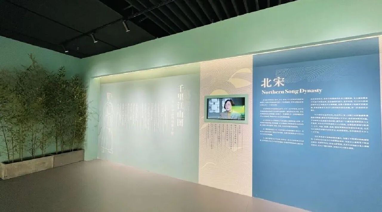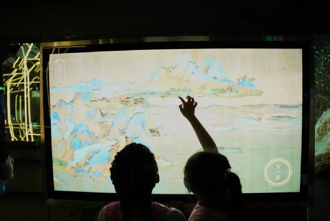 走进历代山水展区,这里简要呈现了中国历代青绿山水画作的发展脉络,从而带领观众更全面地理解山水画的概念,以及中国艺术的精神,游客还可以通过互动屏幕查询详细的画作背景,了解更多的历史文化故事。