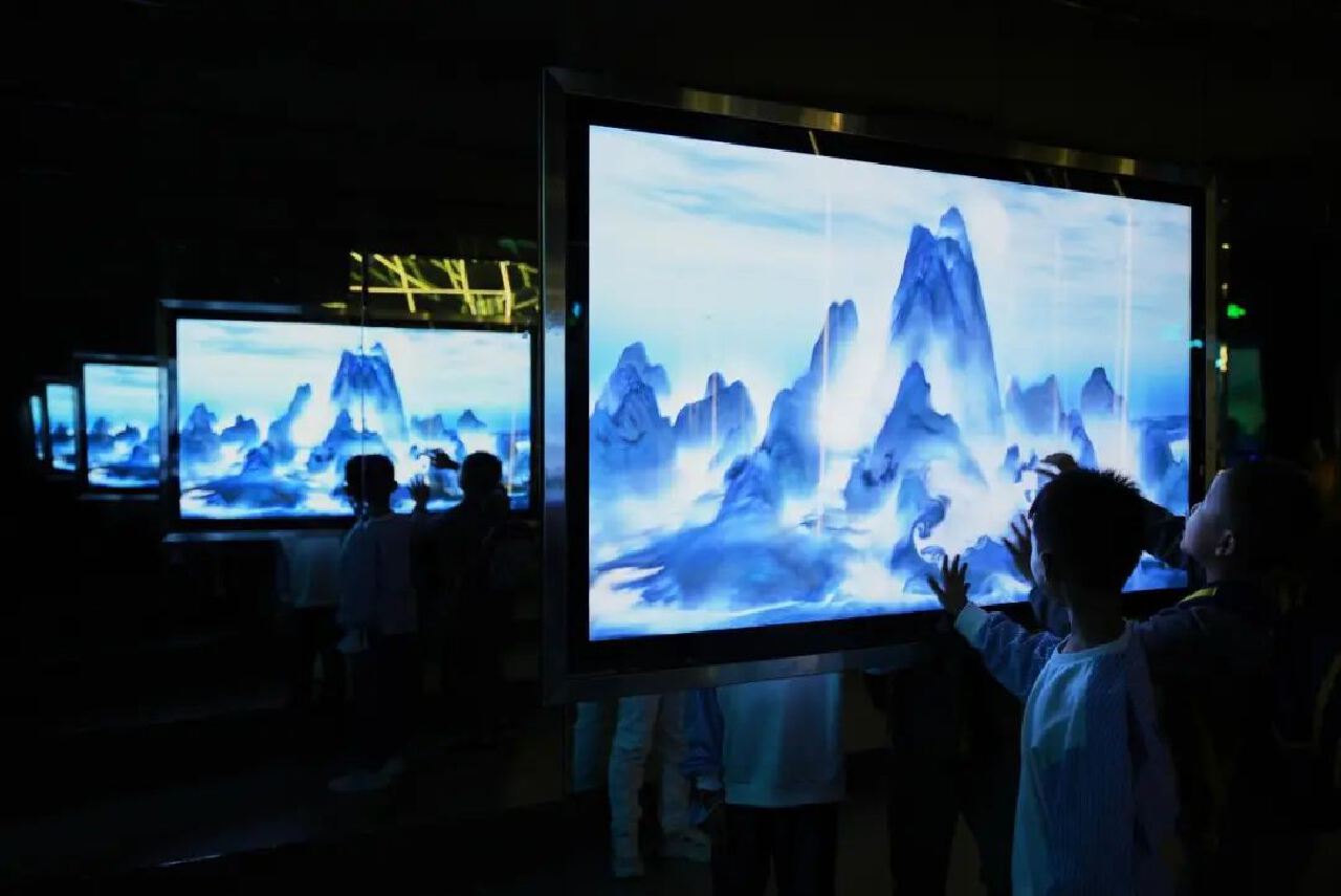 不仅如此,观众在现场还可以根据心中所思所想,在互动装置上泼墨千里、手绘江山,创作属于自己的《千里江山图》现代续篇!完成创作后,扫描二维码,保留这一方专属自己的山水世界。这场穿越时空的“互动”,你爱了吗?