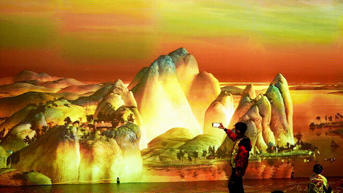 徜徉其间,品读山间四时美景,高崖飞瀑近在咫尺,屋舍长桥触手可及。带观众步入流光溢彩的书画幻境,以磅礴气势让观众近距离感受“动起来”的千古名画。