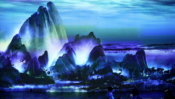 【光影秀】以现代科技为手段,梦幻帷幔为精彩演绎拉开序幕,华美光影随时间变幻、典雅音乐让人沉醉其中,艺术与光影交相辉映,点亮千里江山。