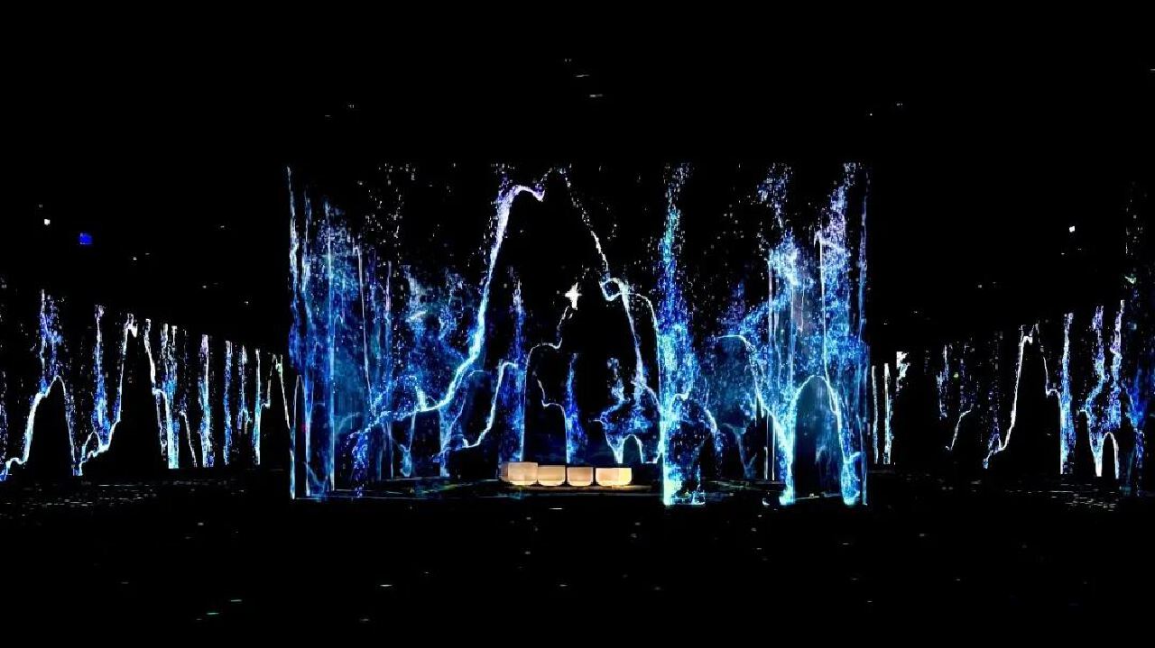 【江山入画】阵列式的山形数字雕塑跃然眼前,焕然一新的青绿山水,预示着一场通往千里江山数字孪生之境即将开始。