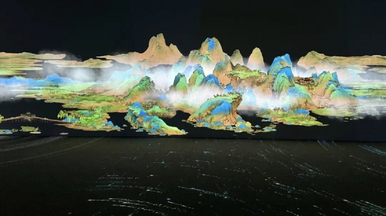 展览以《千里江山图》为创作灵感,大量运用全息投影、虚拟现实、即时交互等前沿科技,将这幅理想世界的缩影又幻化为一场声、光、影完美交融而成的“律动江山”感官盛宴。
