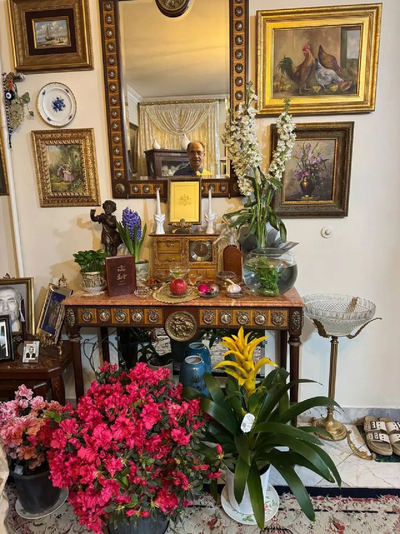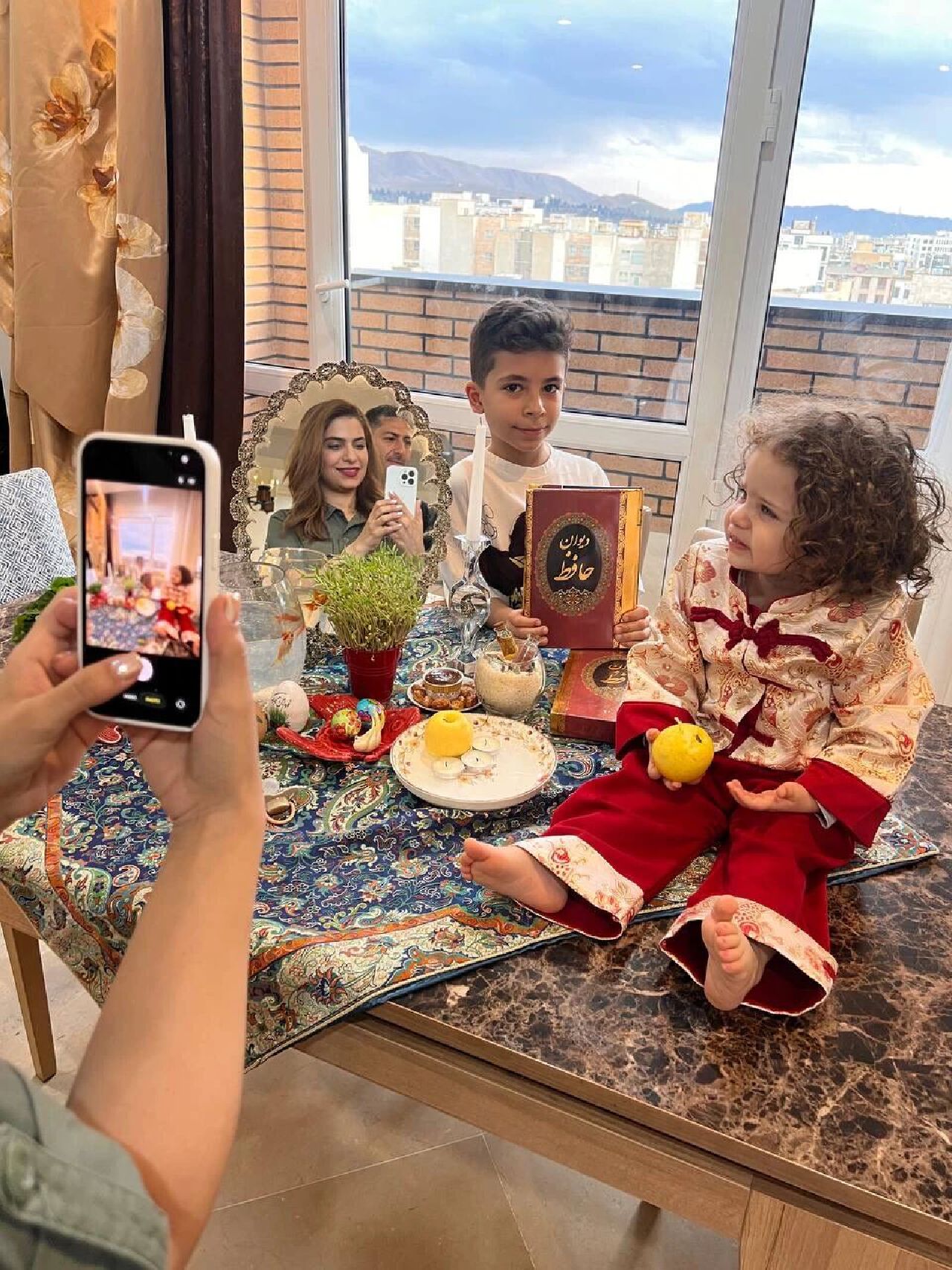 到了伊朗爸爸媽媽家,伊朗爸爸已經在門口等著我了。家裡佈置得特別漂亮,七鮮桌擺得精緻又鄭重。伊朗爸爸指著桌上的鏡子,說那是五十八年前留下來的;旁邊那個器皿,也是五十多年前留下來的古董。桌上擺著七種以波斯語字母“S”開頭的傳統物品,有風信子、大蒜、蘋果、醋、香料、發芽的小麥、金魚,還有一本哈菲茲的詩集。家裡充滿了春天的氣息,像把整個春天都請進了屋裡。