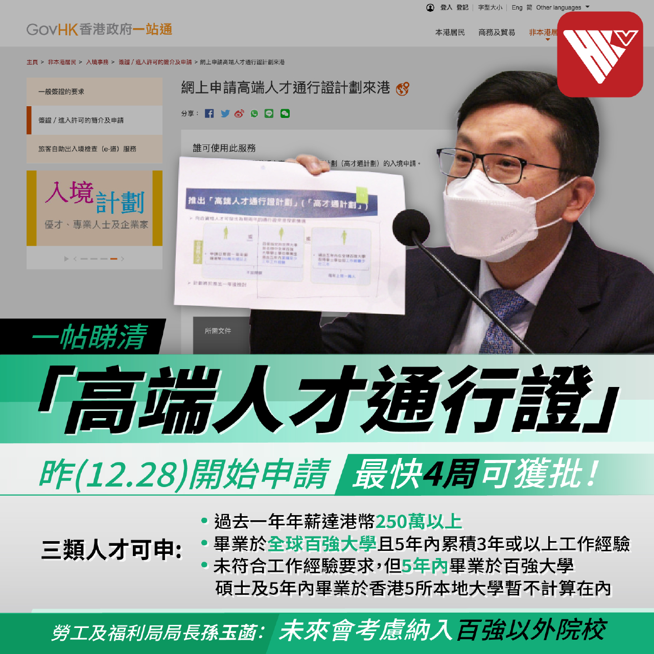 政府早前公佈多項「搶人才、搶企業」措施,當中招攬高薪人才或世界百強大學畢業生的「高端人才通行證計劃」昨日(12.28)起接受申請,香港正式開啟「搶人才」模式!