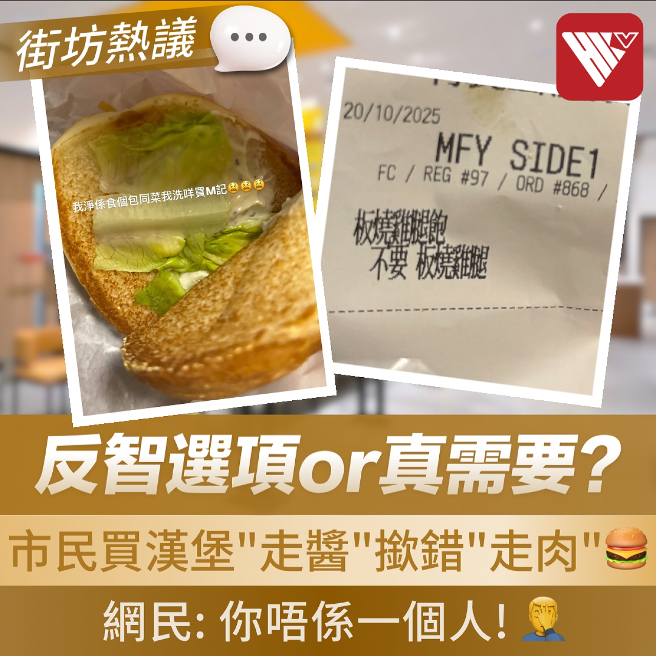 這位事主在社交平台分享自己點餐“板燒雞腿堡”的有趣經歷,原本打算選“不要 醬”,不料卻誤按了“不要 板燒雞腿”,等取餐時才發現漢堡只剩下兩塊麵包夾著一些蔬菜,“漢堡”瞬間變成了“麵包”。帖文一出立即引起大批網民共鳴,不少人紛紛留言表示“你唔係一個人”,更爭相分享自己同樣因按錯選項而收到“素食漢堡”的經歷。