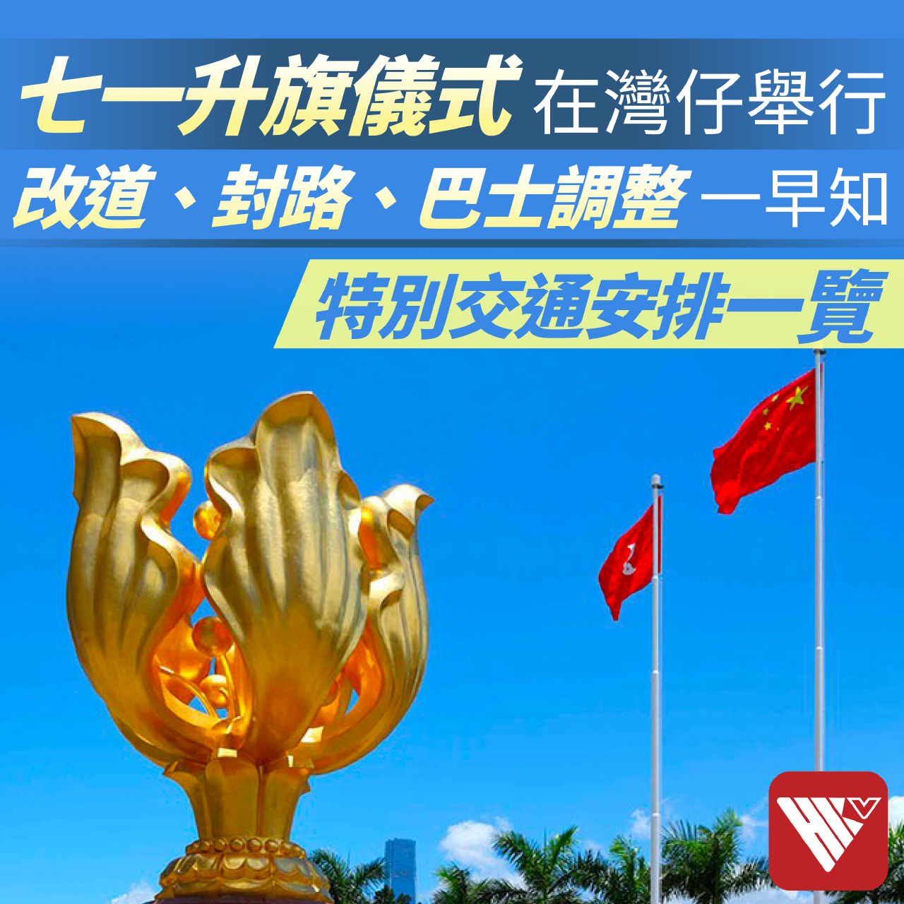 為慶祝香港特別行政區成立26周年,升旗儀式將於7月1日(星期六)上午8時在灣仔香港會議展覽中心外的金紫荊廣場舉行,行政長官李家超將出席升旗儀式和隨後的慶祝酒會,現場不設公眾觀禮區。