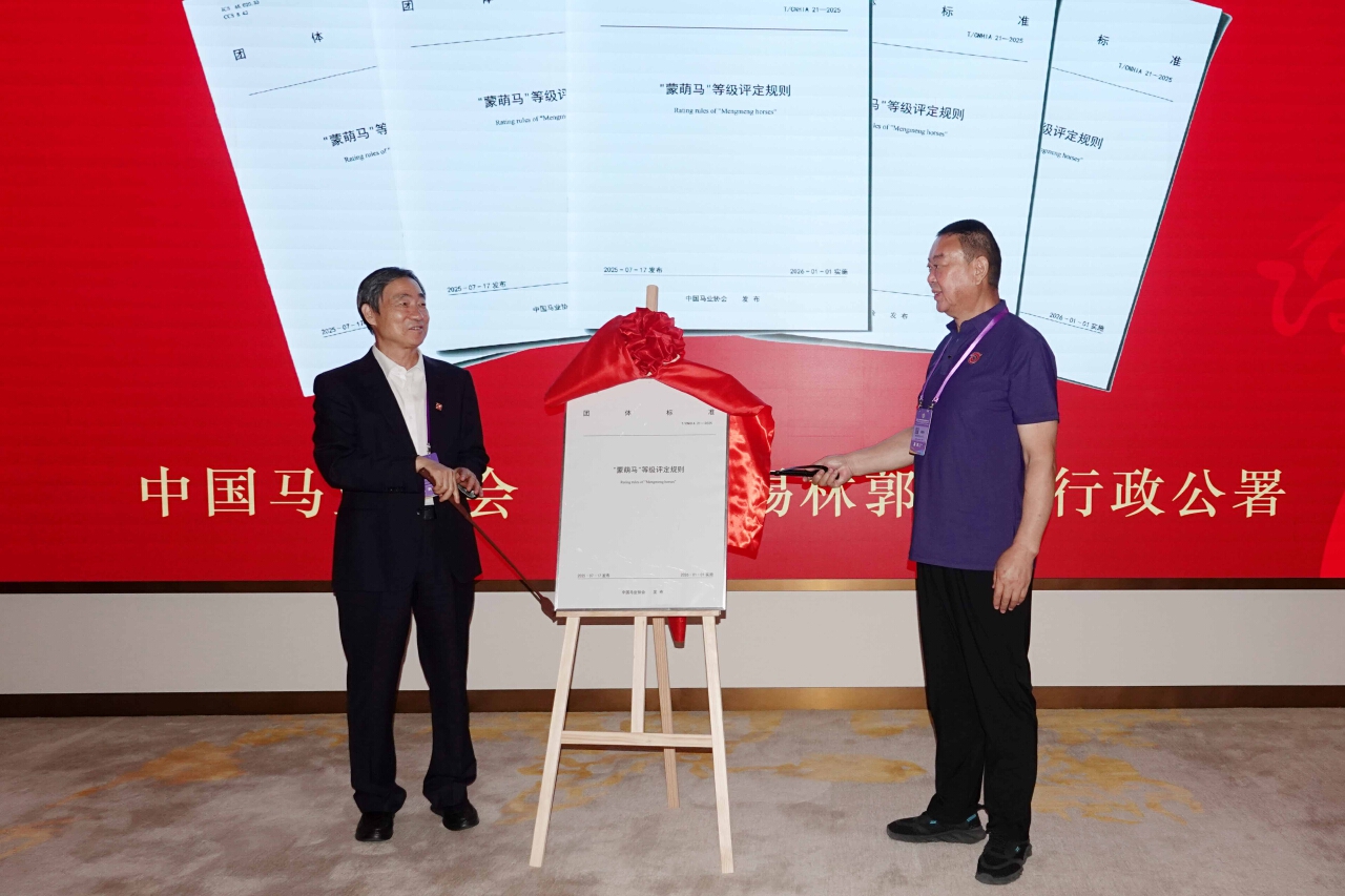 发布会上详细解读并首次揭牌由内蒙古锡林郭勒盟与中国马业协会合作、通过系统调教蒙古马培育出的PONY马品种——蒙萌马的等级评定规则。