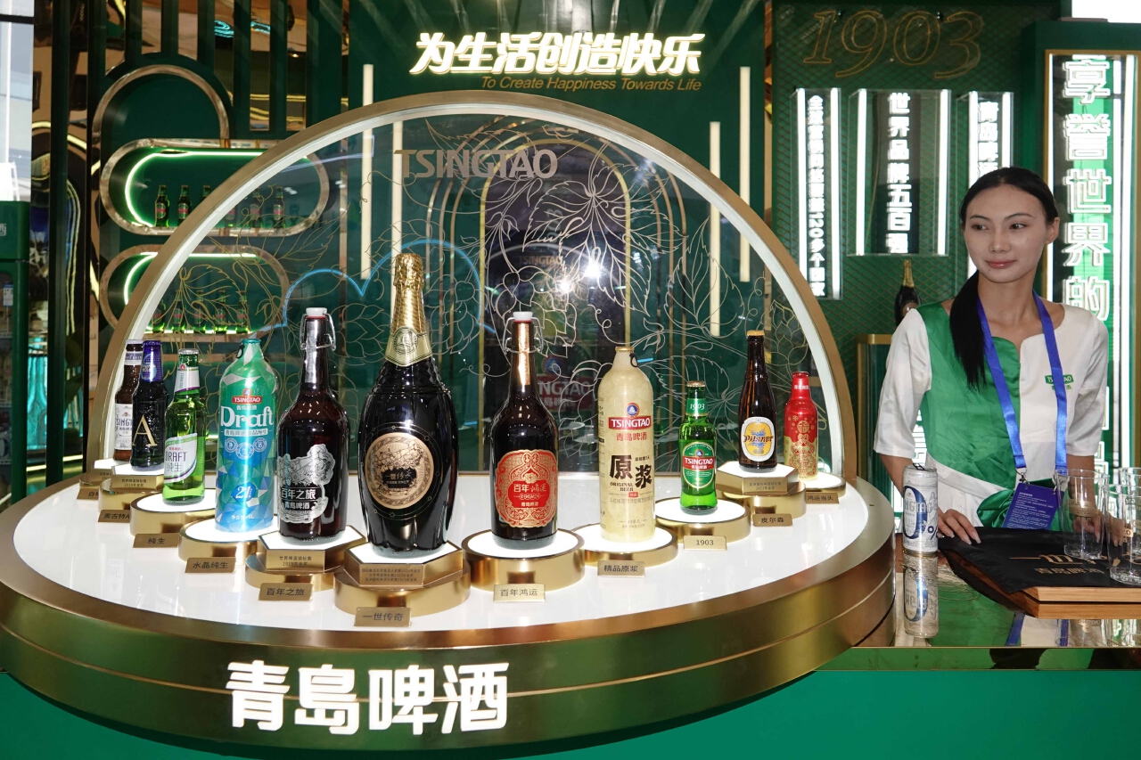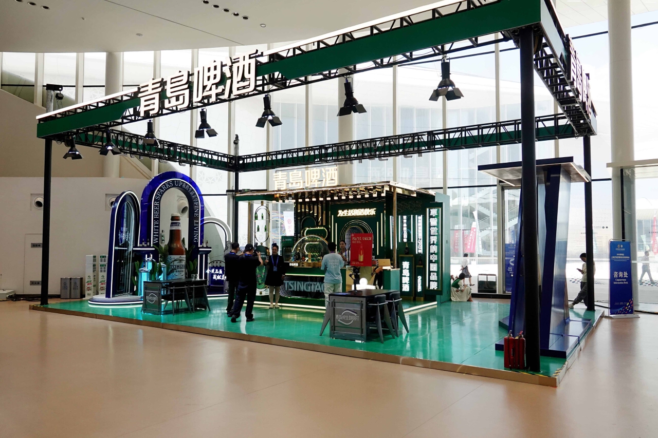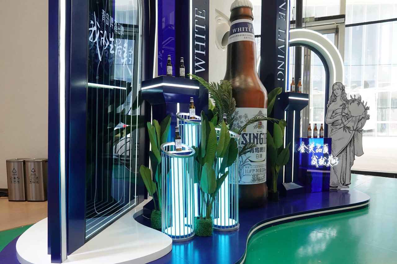 陈列于上合之珠国际博览中心G馆多功能馆内的青岛啤酒特色展柜。