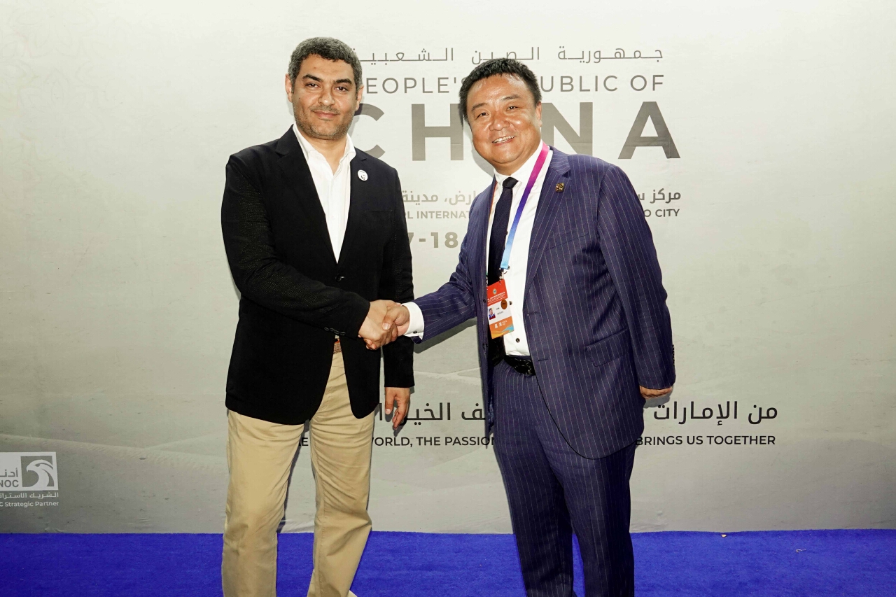 阿联酋阿拉伯马协会总干事穆罕默德·阿尔·哈尔比与中国马业协会秘书长岳高峰合影。