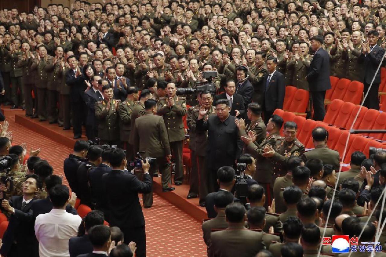 朝鮮在勞動黨中央總部舉行向海外作戰指戰員授予國家英雄勛章授勛式。金正恩又握起了拳頭,這是金正恩在戰略導彈發射成功之後的經典慶祝動作。