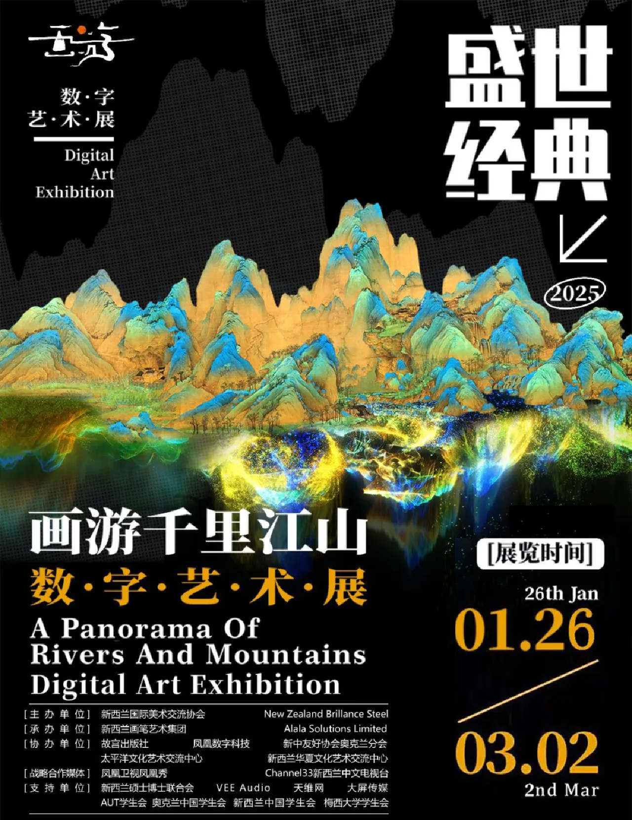 3月,由新西兰国际美术交流协会与NZ Brilliance Steel联合主办,新西兰画笔艺术集团承办,凤凰数字科技、故宫出版社与新中友好协会奥克兰分会协办,凤凰卫视凤凰秀、Channel33新西兰华人电视台作为战略合作媒体的“盛世经典”「画游千里江山」数字艺术展在奥克兰圆满落幕。展览作为 2025 年新西兰 “欢乐春节” 系列活动的开篇之作,展期内以来吸引了众多观众进场参观,在奥克兰成功打造了一场文化艺术与数字科技深度融合的沉浸式视听盛宴,开创了中华文化国际化传播的新范式。