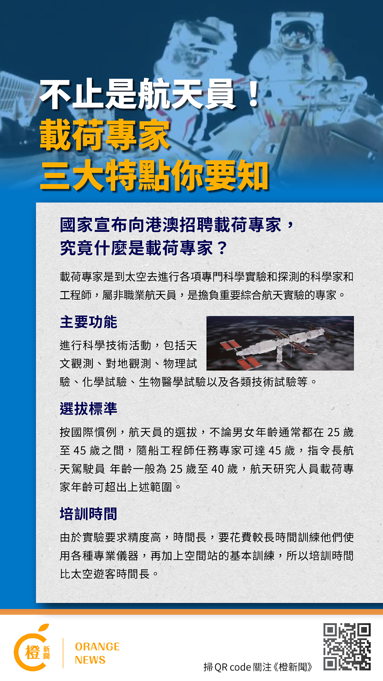 【橙訊】載荷專家簡單而言是到太空去進行各項專門科學實驗和探測的科學家和工程師,他們是非職業太空人,是擔負重要綜合航天實驗的專家。