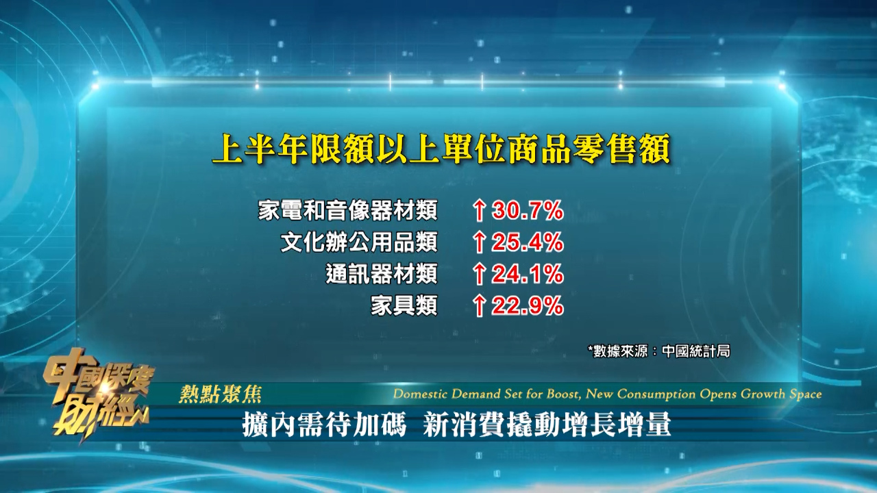 上半年來以舊換新政策持續發揮效應,帶動升級類消費快速增長。上半年,限額以上單位家用電器和音像器材類、文化辦公用品類、通訊器材類、傢俱類商品零售額同比分別增長30.7%、25.4%、24.1%、22.9%。