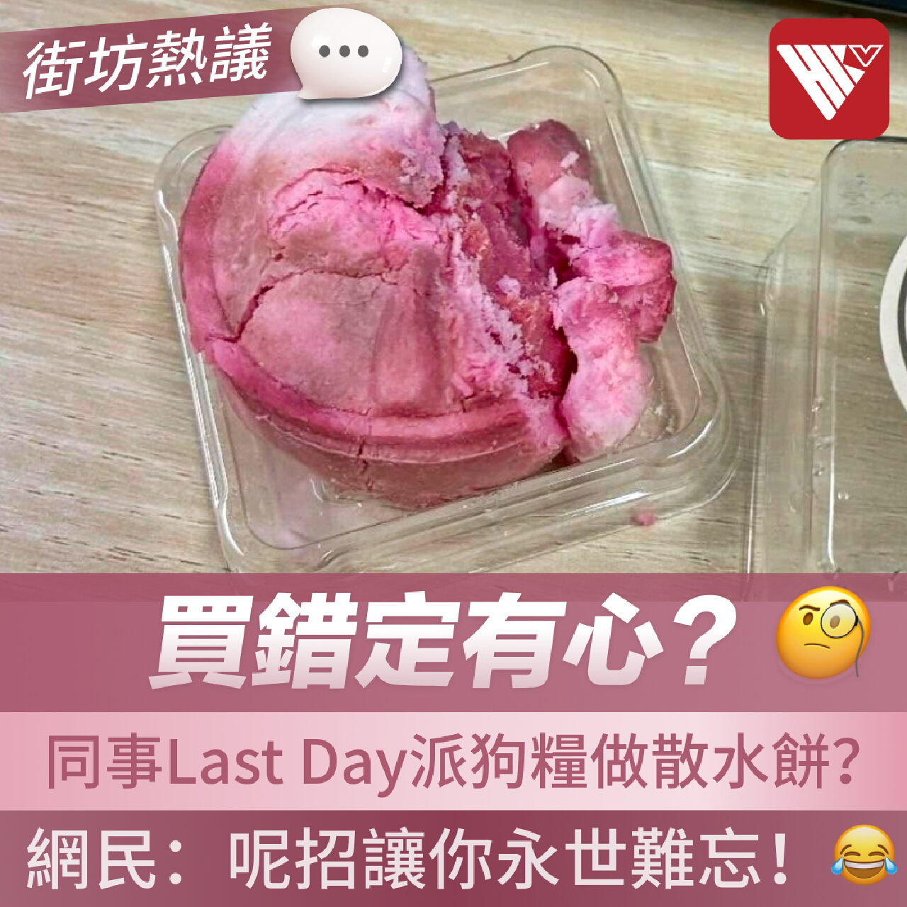 事主在社交平台發文,指十月尾有同事離職時派發月餅,自己"唔小心食咗",其後才驚覺是狗糧。他不禁懷疑對方是想藉此暗諷他"返工似狗"。根據帖文圖片,事主食下的相信是紅菜頭口味的寵物月餅,這場意外的"餞行"令他哭笑不得。