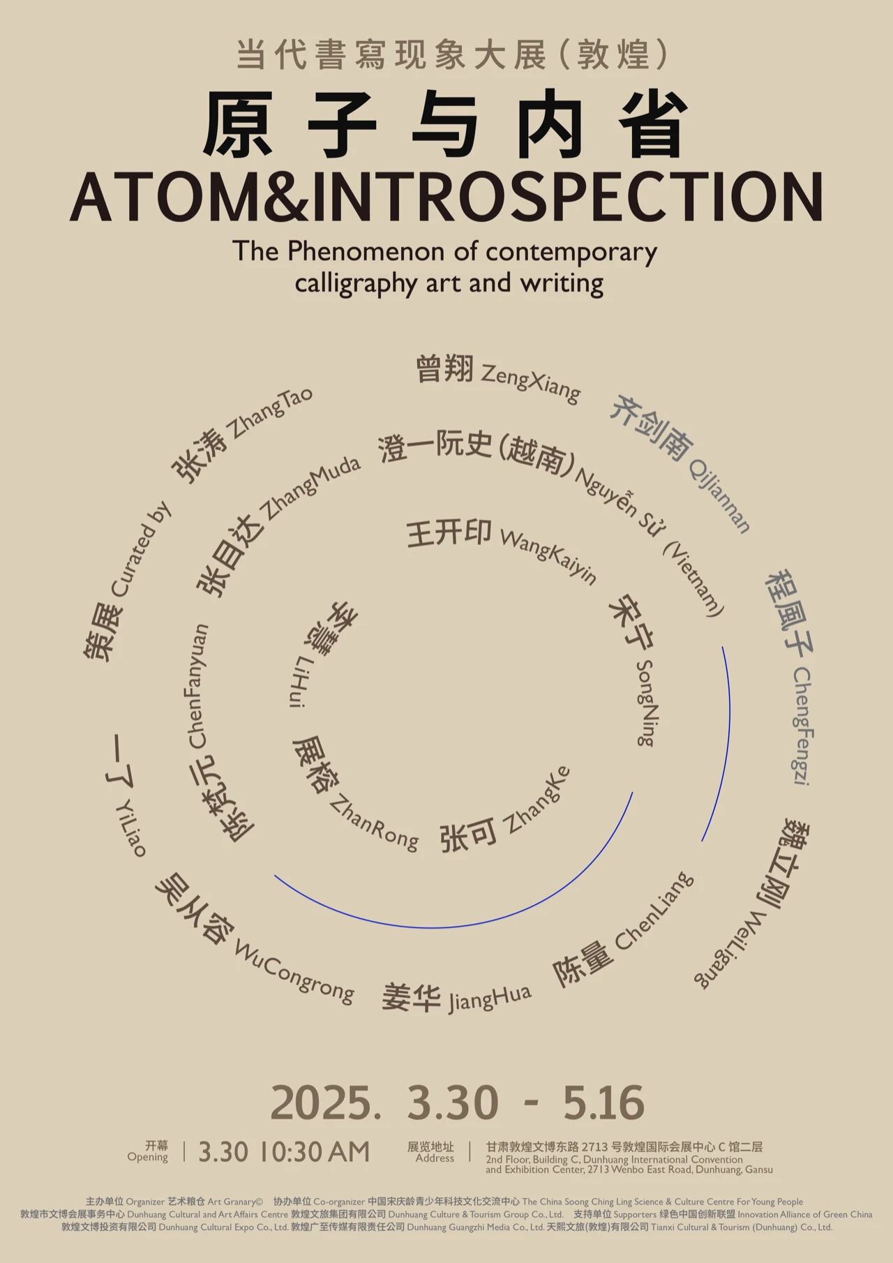 On March 30, 2025, the 《Atoms and Introspection》 contemporary calligraphy phenomenon exhibition, jointly launched by Art Granary and multiple institutions, will debut at the Dunhuang International Convention and Exhibition Center. Rooted in the spiritual coordinates of “atoms and introspection,” this groundbreaking artistic endeavor gathers 16 pioneering creators from China and abroad, including Zeng Xiang, Qi Jiannan, Cheng Fengzi, Wei Ligang, Yi Liao, Jiang Hua, Wu Congrong, Chen Fanyuan, Zhang Muda, Chen Liang, Nguyễn Sử(Vietnam), Wang Kaiyin, Li Hui, Song Ning, Zhan Rong and Zhang Ke, to reimagine the contemporary breakthrough of writing within the civilizational gene pool of the Mogao Grottoes’ scripture manuscripts and Xuanquanzhi bamboo slips. Centered in Dunhuang, the exhibition transforms millennia-old textual relics from the Silk Road into experimental fields—artists deconstruct Chinese characters atomically with ink, weave spatial narratives with digital code, and unfold a decolonizing cultural reinterpretation between the cracked textures of bamboo slips and the fluid trajectories of algorithms. Beyond interrogating writing’s identity anxiety in a globalized context, the exhibition seeks to awaken the latent futurity embedded in Dunhuang’s cultural heritage.