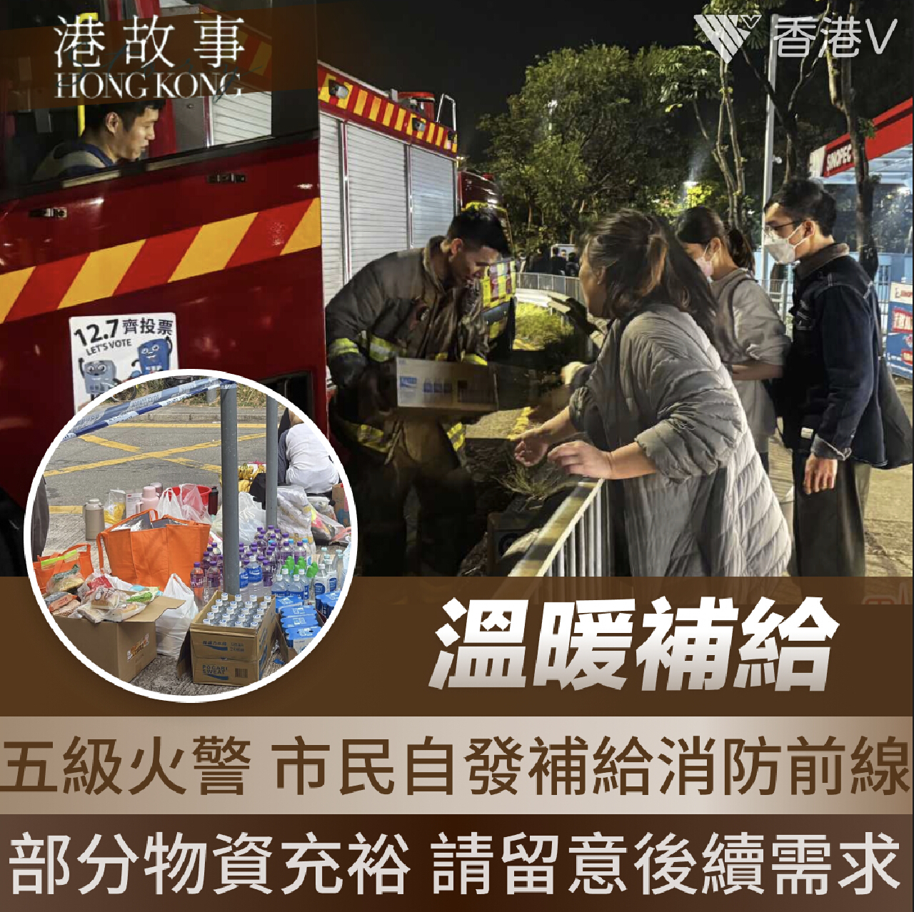香港大埔宏福苑於26日發生五級火警,連日救援行動牽動全城民心。在消防人員奮力撲救的同時,市民也自發進行著愛心補給行動。
