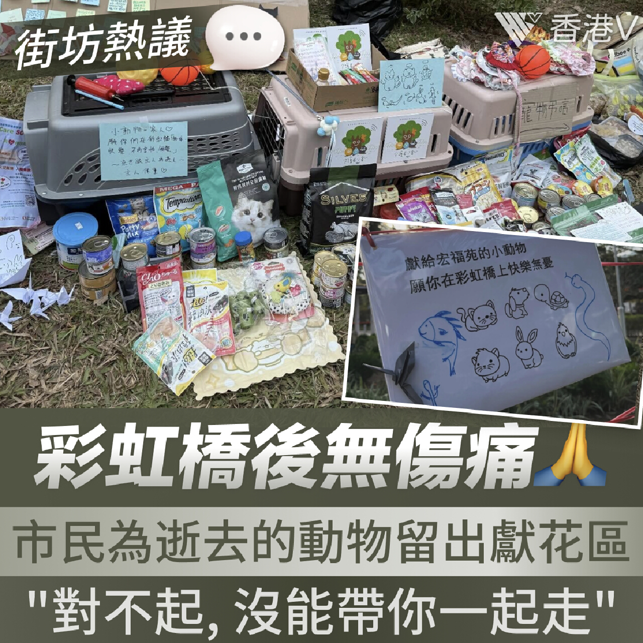 11月26日大埔宏福苑發生五級火災,造成嚴重傷亡,連日來不少市民自發前往現場哀悼。除了鮮花與悼念卡,社區角落出現一片特殊的”寵物獻花區”,堆滿了貓糧、狗糧、罐頭、寵物衣物和玩具。