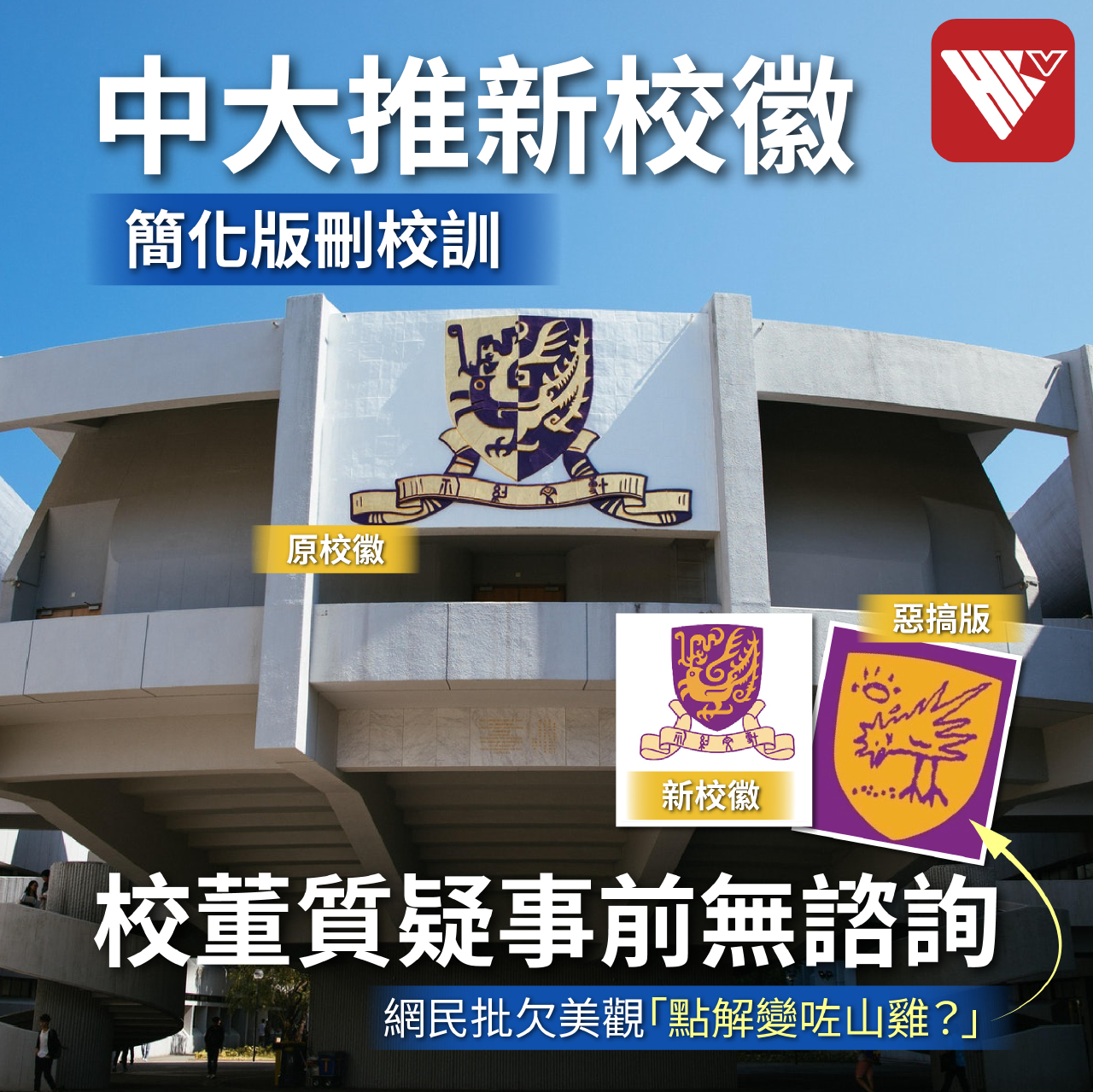 中大已更新校方網頁及其社交平台,FB專頁亦換上新校徽圖片,不少網民前往留言,有意見認為帶來全新氣象,亦有人批評新校徽欠美觀「點解變咗山雞?」,認為省略校訓難彰顯中大辦學宗旨。