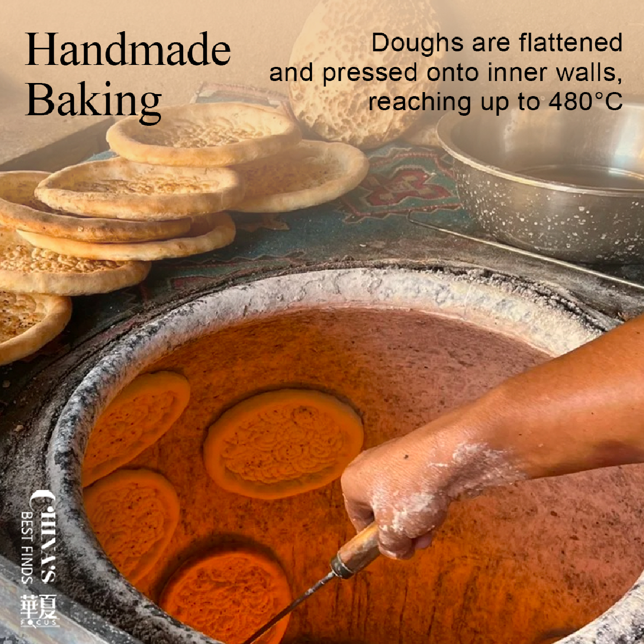 獨特的工藝:看著面團被壓平,貼在480°C的烤爐壁上。這是純粹的、熾熱的手工藝術!