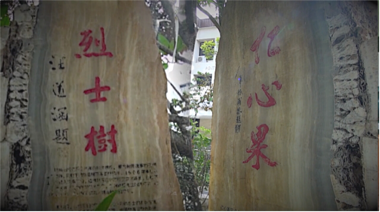 园内有两块石碑,分立花园左右,一块刻着海协会会长汪道涵题写的“烈士树”,另一块刻着海基会董事长辜振甫题写的“仁心果”。