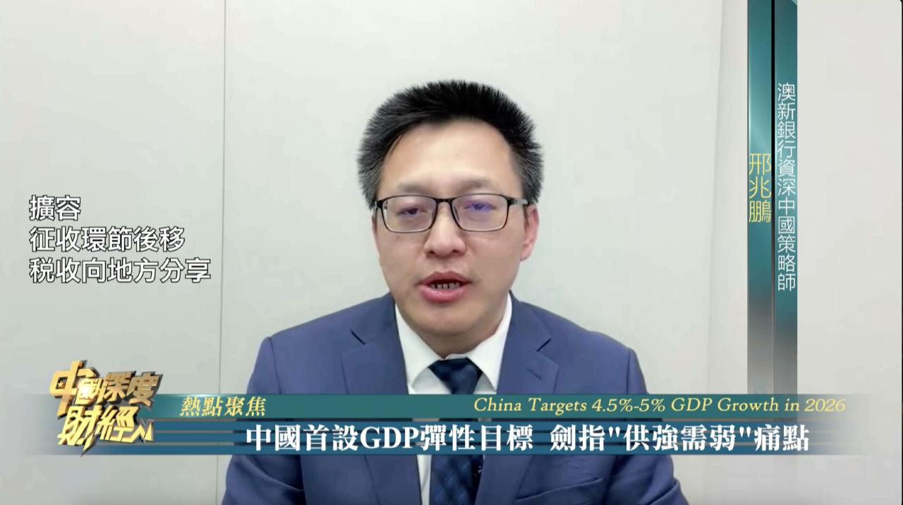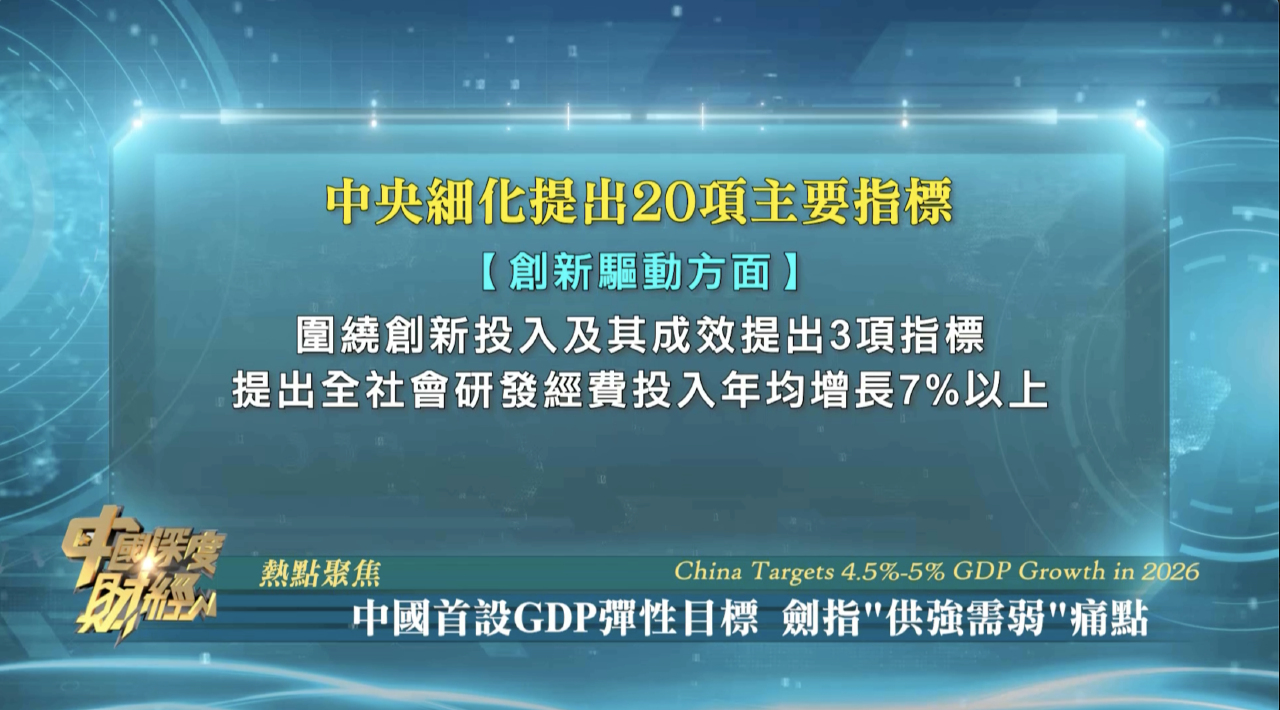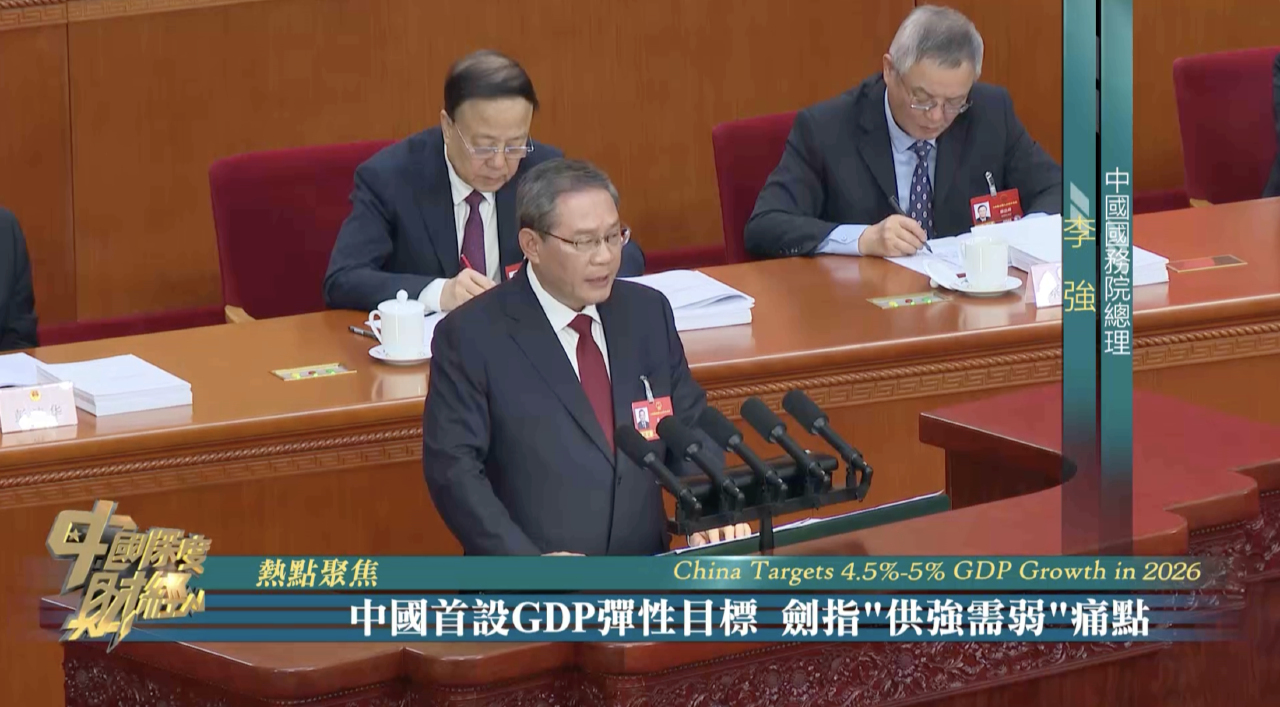 本周全国两会在北京召开,中国国务院总理李强3月5日作政府工作报告时表示,对于备受关注的2026年中国经济增长预期,中央将今年的GDP增长目标调降为4.5%-5%区间,并强调“在实际工作中努力争取更好结果”。
