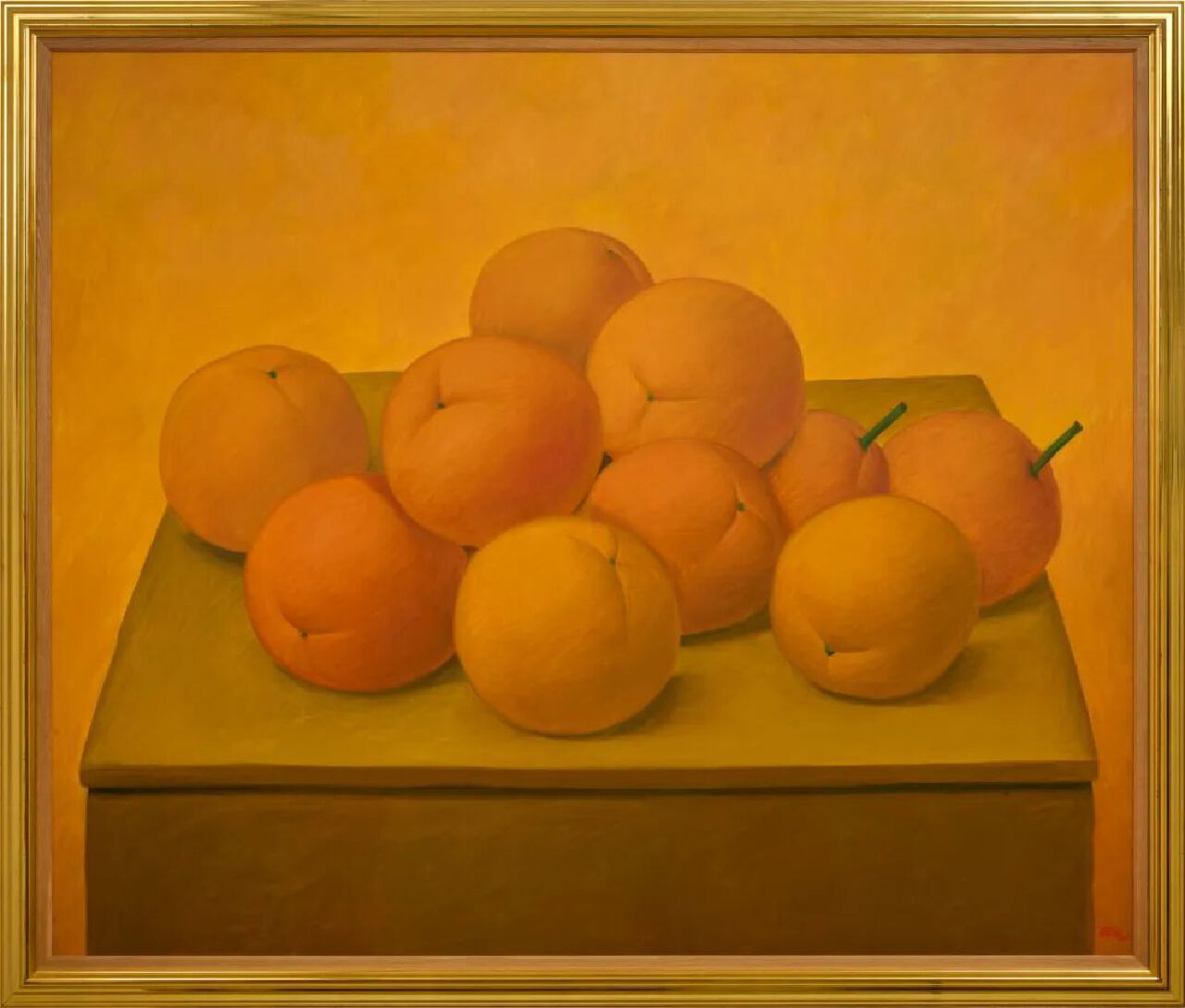 《踢足球的孩子》中悬停的足球,仿佛凝固着博特罗童年社区球赛的沸腾瞬间,《家人与宠物》里膨胀的橘猫与笼鸟与家人相视,毛发间的每道皱褶都挤压出家庭的密度与温度,而他笔下所描绘的橙子,也仿佛必须让它饱满得快要溢出汁液,才能传递记忆中咬下果肉时爆开的甜香。