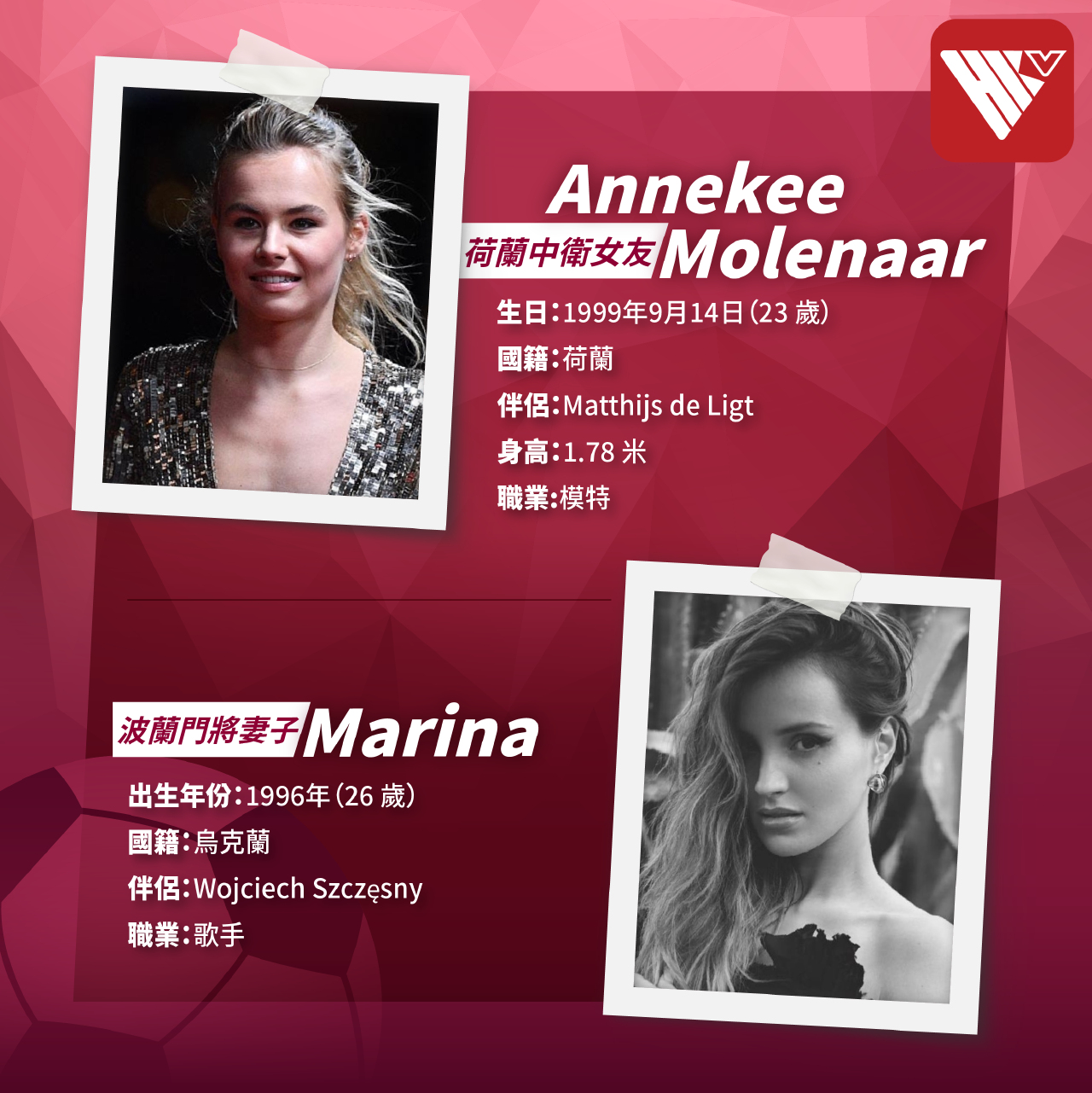 荷蘭隊中衛Matthijs de Ligt女友亦大有來頭,Annekee Molenaar是一名超模,16歲時已為《Vogue》擔任時裝模特兒,是位學霸,在大學拿到了法律學位,會多國語言練,瑜伽、玩衝浪和極限賽車都是她的愛好,可說是才貌雙全,是不折不扣的智慧與美麗的化身。二人於已相戀多年,日常穿搭走優雅而簡約路線,精緻而具記憶點的外貌輪廓,加上超模健康身材,十分亮眼!相信球迷在賽場上會有不少機會看到她的身影。