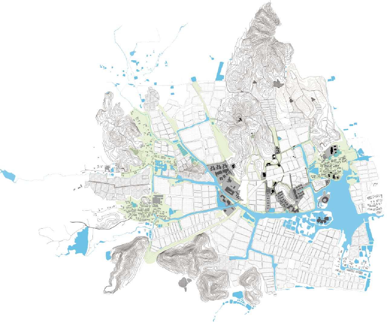 穿过一片稻田,白墙黛瓦、木格窗棂的江南明清建筑群悄然进入眼帘,在这里野蛮生长的建筑与土地自成一派,自然、宁静、古朴的氛围使人仿佛进入了现代化城市的背面。然而,在几千年前,这就是最繁华的地区。