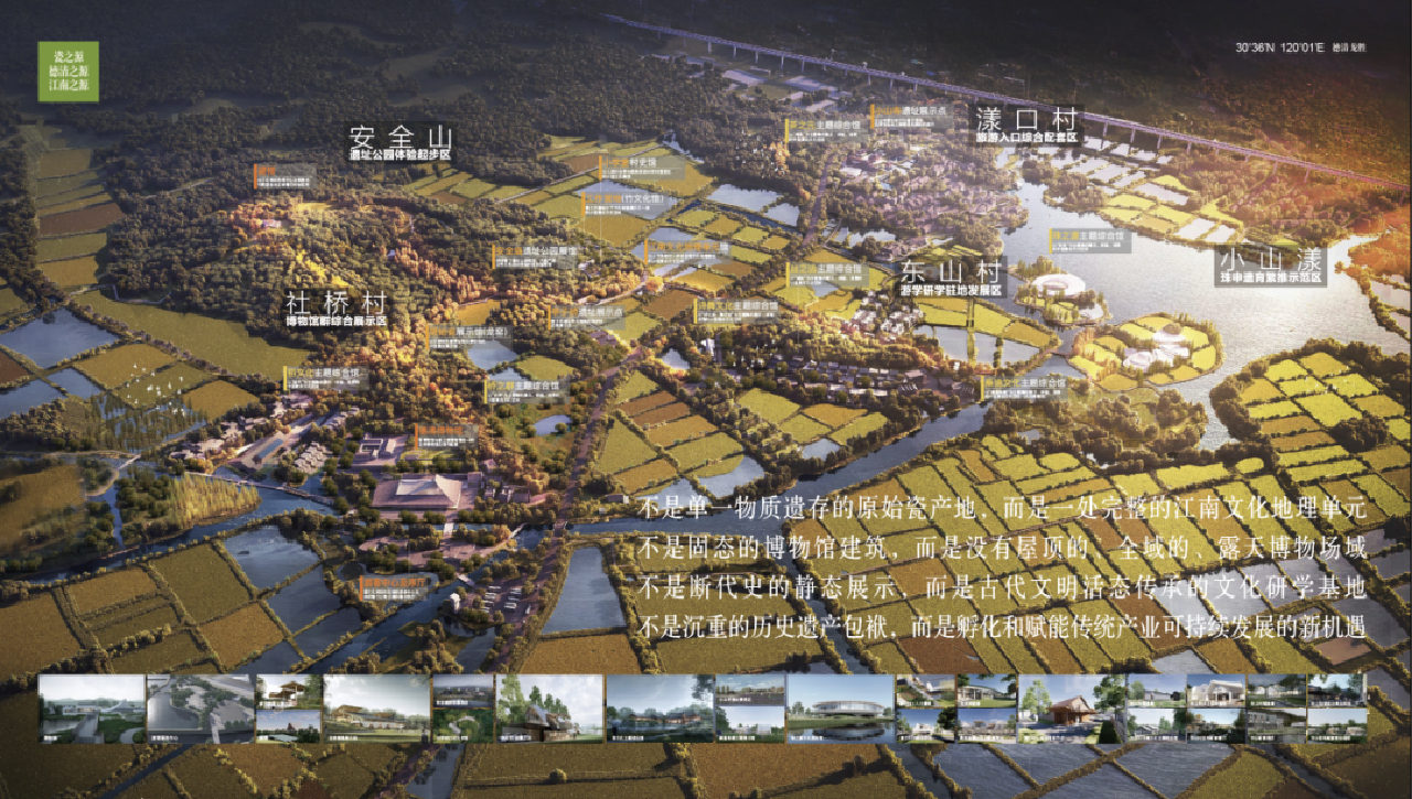 在悠久历史文化底蕴的基础上,德清依托原有村落布局与自然地理环境,围绕“源文化”这一核心概念,打造了“江南之源”文化遗址公园,并将其规划为五大功能分区。