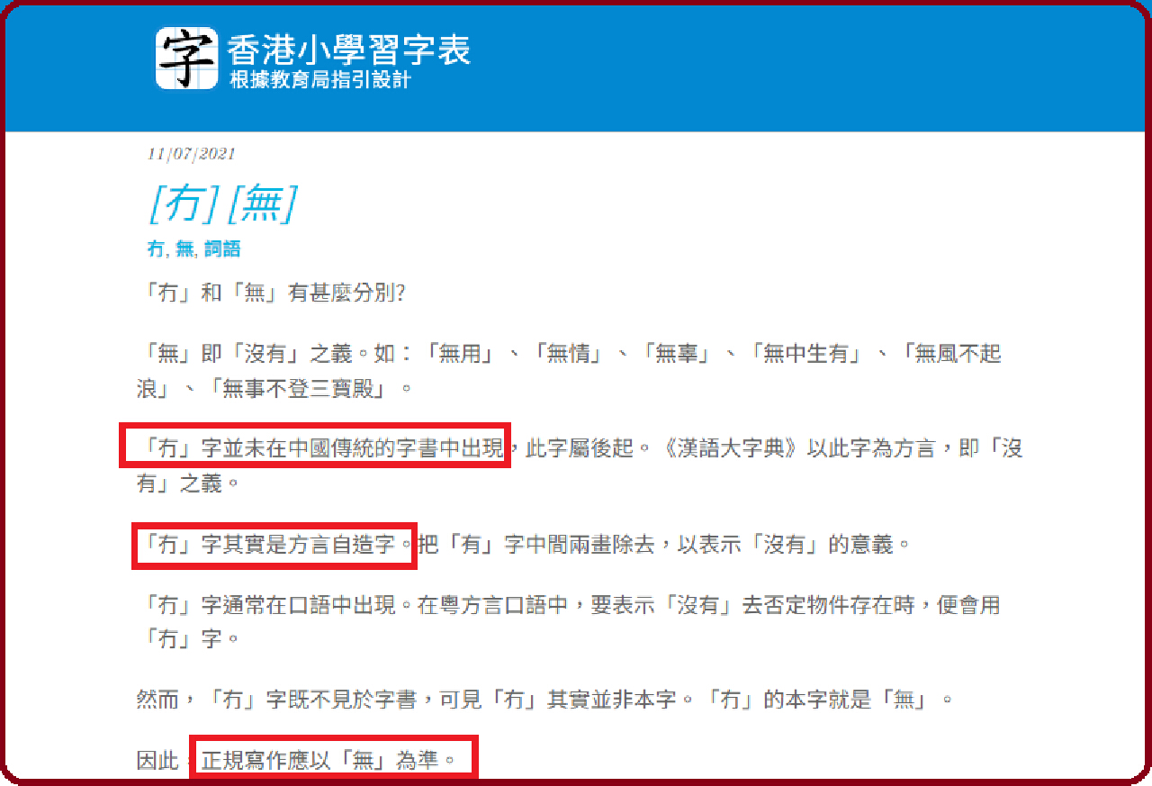文章指出:“然而,‘冇’字既不見於字書,可見‘冇’其實並非本字。‘冇’的本字就是‘無’。因此,正規寫作應以‘無’為準。”
