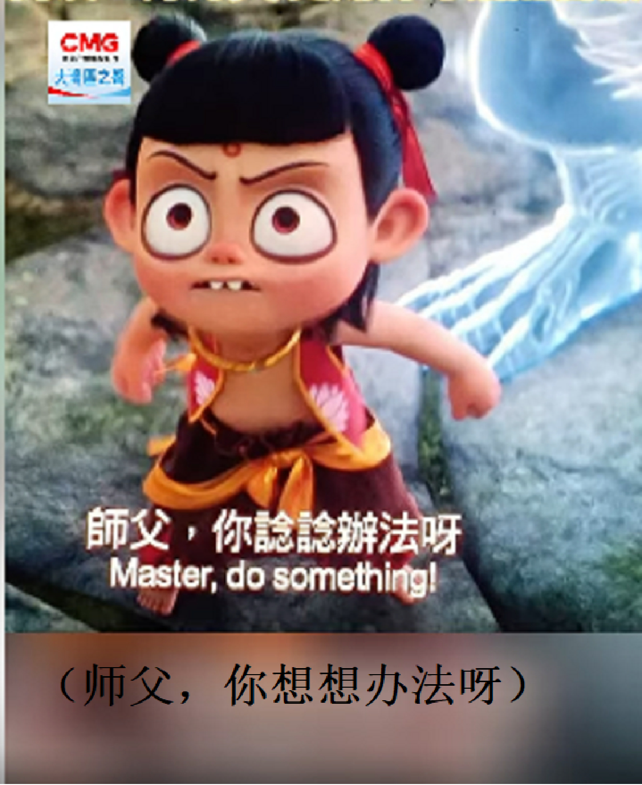 粤语的太乙真人说,“师弟,你唔好吓亲佢”,字幕是:“師弟,你別嚇到它” 。