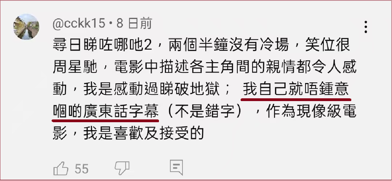 在油管,香港观众“cckk15”留言说:“我自己就唔鍾意嗰啲廣東話字幕”。