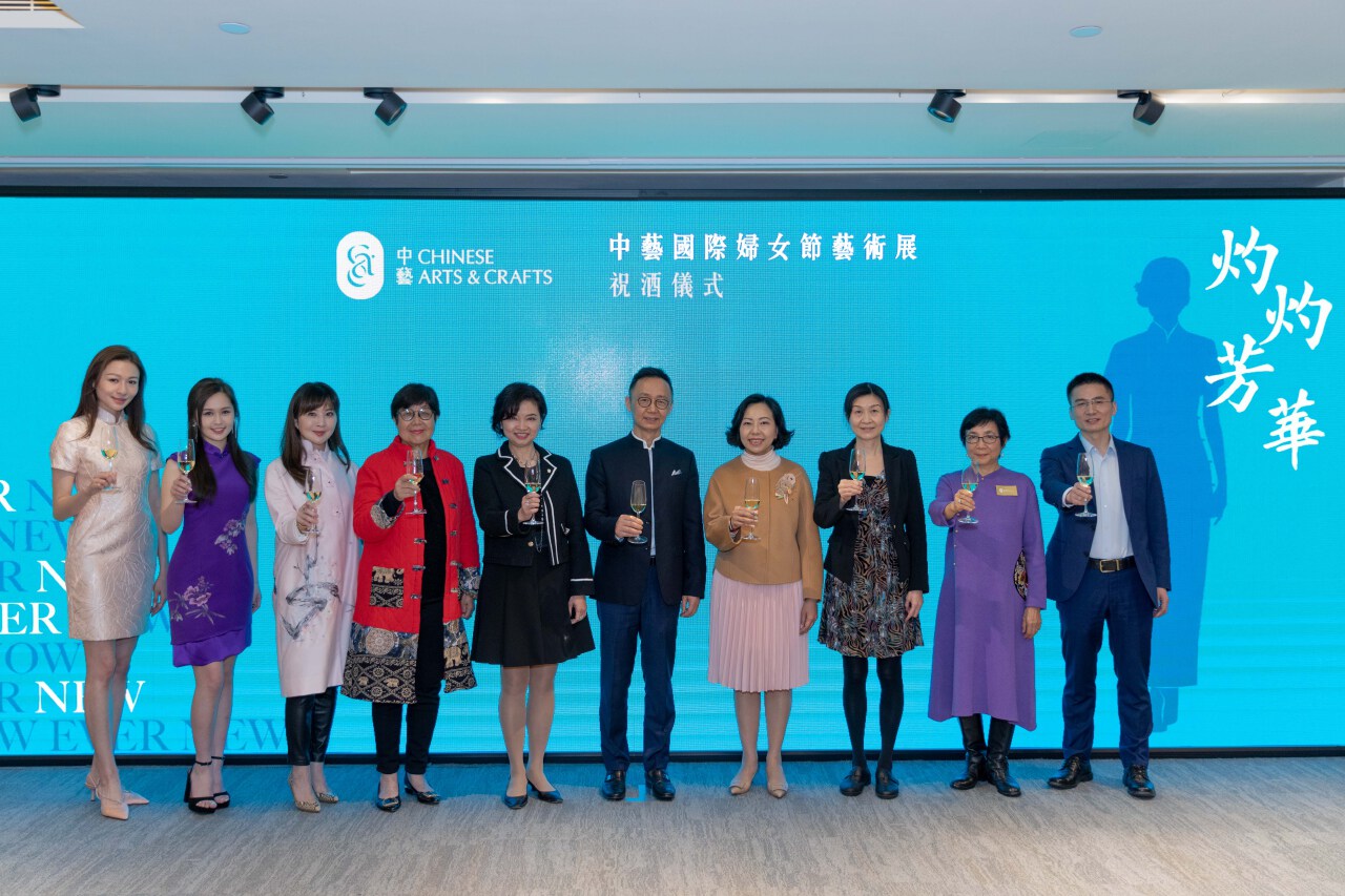 接著,華潤物業董事長兼中藝(香港)董事長包燕飛先生、香港特區政府民政及青年事務局局長麥美娟女士,SBS,JP、港區人大代表蔡素玉太平紳士、中聯辦辦公廳一級調研員鄧夏夜、大華銀行大中華區行政總裁葉楊詩明女士、香港展能藝術會主席林彩珠女士、中藝香港有限公司總經理朱永紅先生、香港島婦女聯會常務會長張馨玲女士、本年度香港小姐冠軍林鈺洧、本年度香港小姐季軍梁超怡女士受邀作為主禮嘉賓為展覽祝酒,祝願此次展覽順利舉辦。