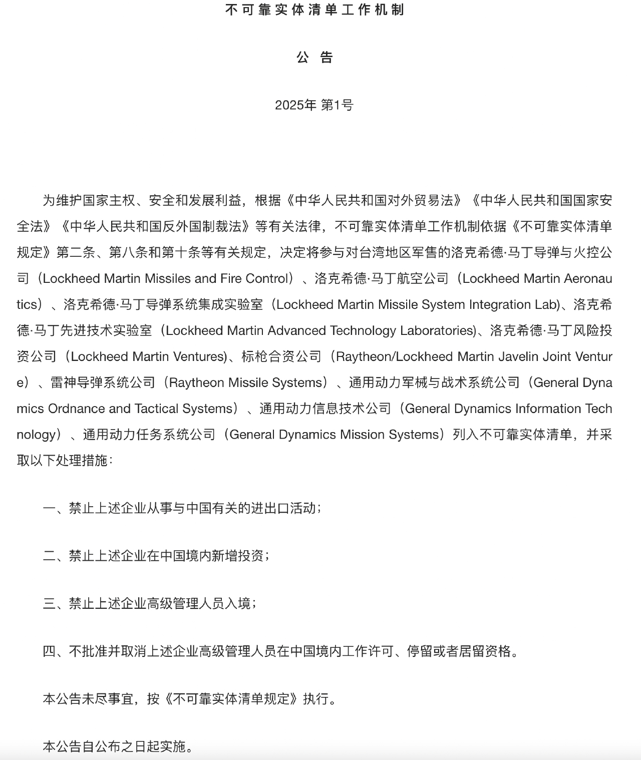 即日起,禁止上述企業從事與中國有關的進出口活動;禁止上述企業在中國境內新增投資;禁止上述企業高級管理人員入境;以及不批准並取消上述企業高級管理人員在中國境內工作許可、停留或者居留資格。