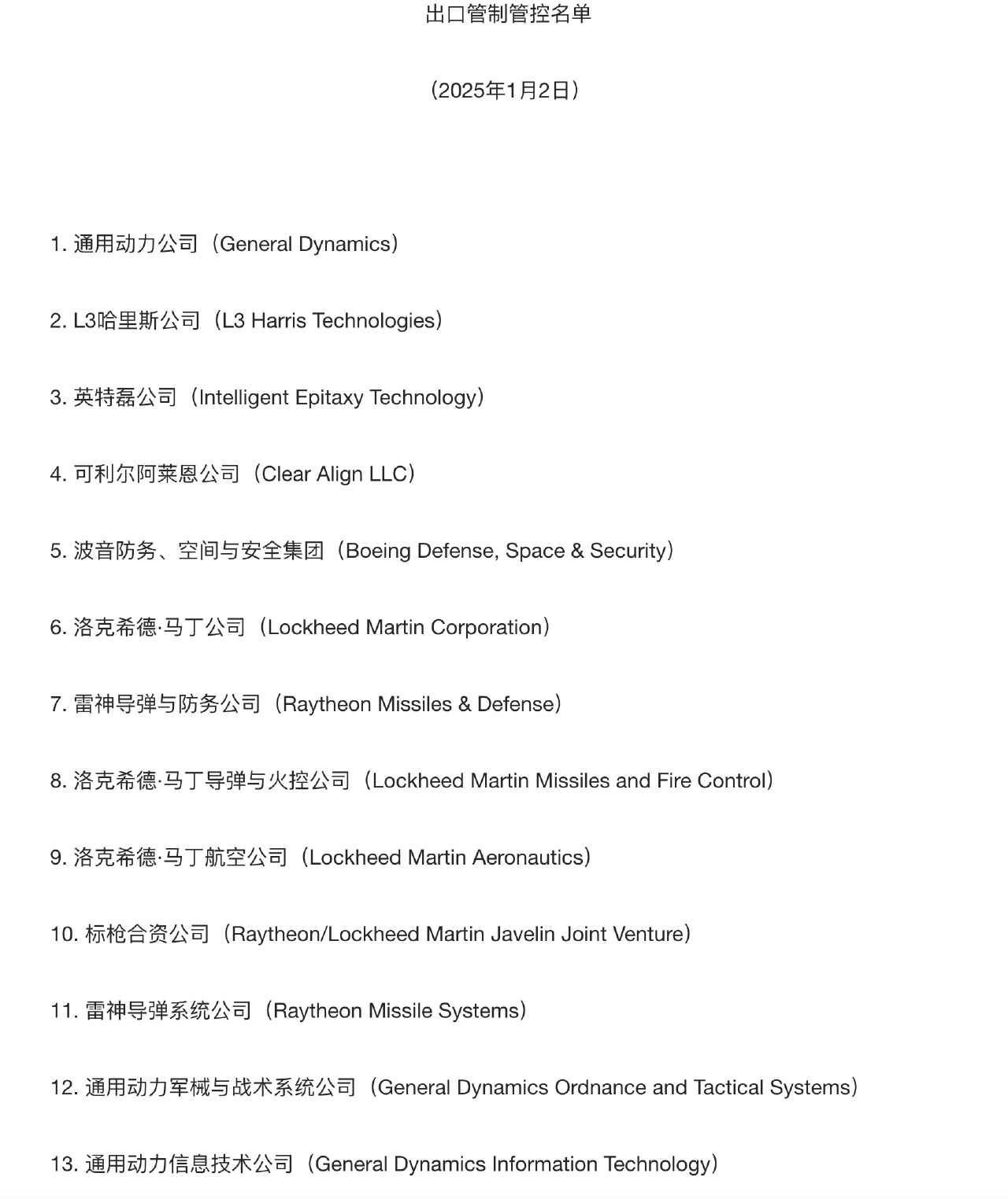 商務部同天公佈,將28家美國實體列入出口管制管控名單。稱為維護國家安全和利益,履行防擴散等國際義務,決定將通用動力公司等28家美國實體列入出口管制管控名單,禁止向這28家美國實體出口兩用物項;正在開展的相關出口活動應當立即停止;特殊情況下確需出口的,出口經營者應當向商務部提出申請。
