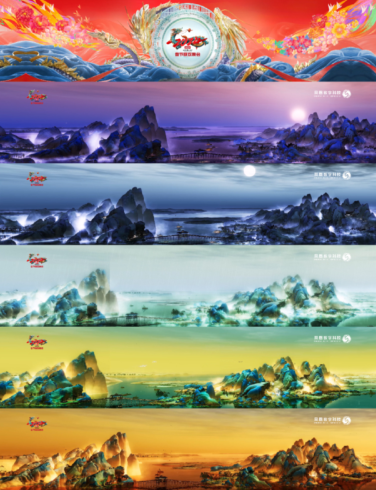 江河烟波浩渺,群山层峦起伏,两条神龙缓缓拉开序幕,一幅青绿色山水美景跃然眼前……这是由凤凰数字科技制作的,拥有实时分层渲染技术与时间变换系统的“画游千里江山”动态数字长卷,画面交替展现破晓、白昼、雨后、黄昏、月夜5种山水梦幻场景。让观众可以近距离感受动起来的千古名画《千里江山图》。