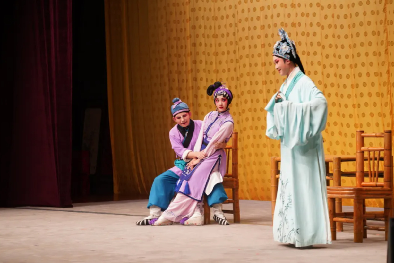 紧随其后献演的淮剧小戏《赶脚》是国家文华节目奖获奖作品,以一场“身份误会”引发一串妙趣横生的互动。轻松活泼的市井对白、诙谐生动的表演,让场内充满笑声。演员每一次展示毯子功、翻、打、滚、踢等戏曲程式表演,都能赢得观众阵阵掌声与喝彩。三位平均年龄仅24岁的青年演员,以创新演绎赋予角色鲜活的生命力。