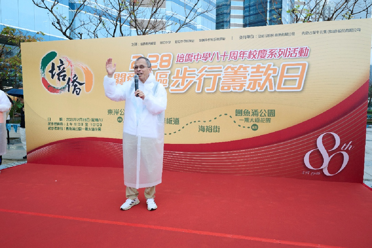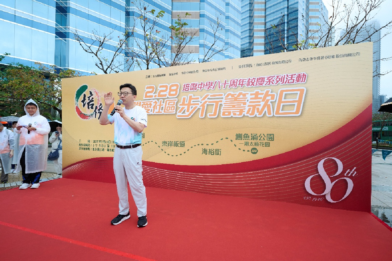 培僑中學曾鈺成校監在歡迎辭中幽默地表示:“天知道培僑中學要籌款,表示支持,給了很多‘水’(資源)。”他指出,在雨中進行集體步行是一項挑戰,但他看到參加者熱情不減、團結奮進,這份精神定能為受災同學帶來溫暖。他亦預告了隨後的校慶系列活動,包括五月的師生校友文藝演出,以及十一月將於會展舉行的盛大晚宴。