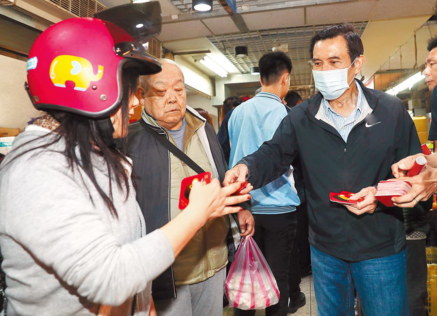 马英九循例到住家附近的兴隆市场、土地公庙发春联及福袋,不过今年他全程戴口罩,多以拱手代替握手拜年,但对合照要求是来者不拒。