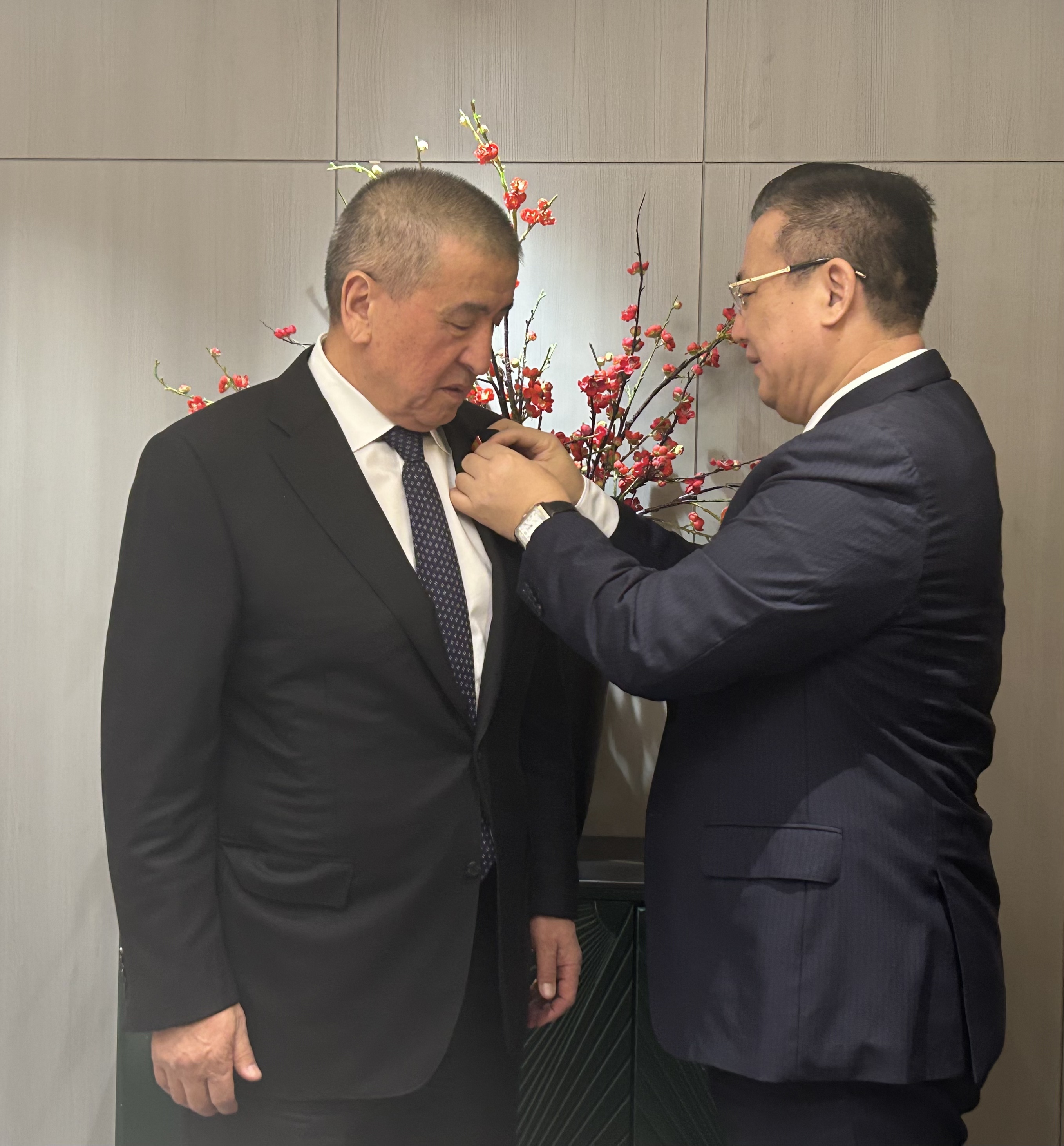 當地時間2026年4月4日,絲綢之路和平獎基金會主席邵長淳在吉爾吉斯斯坦首都比什凱克,為吉爾吉斯斯坦前總統索隆拜·沙裡波維奇·熱恩別科夫頒發「絲綢之路人文合作獎」,表彰其為推動中吉人文交流與友好合作作出的突出貢獻。