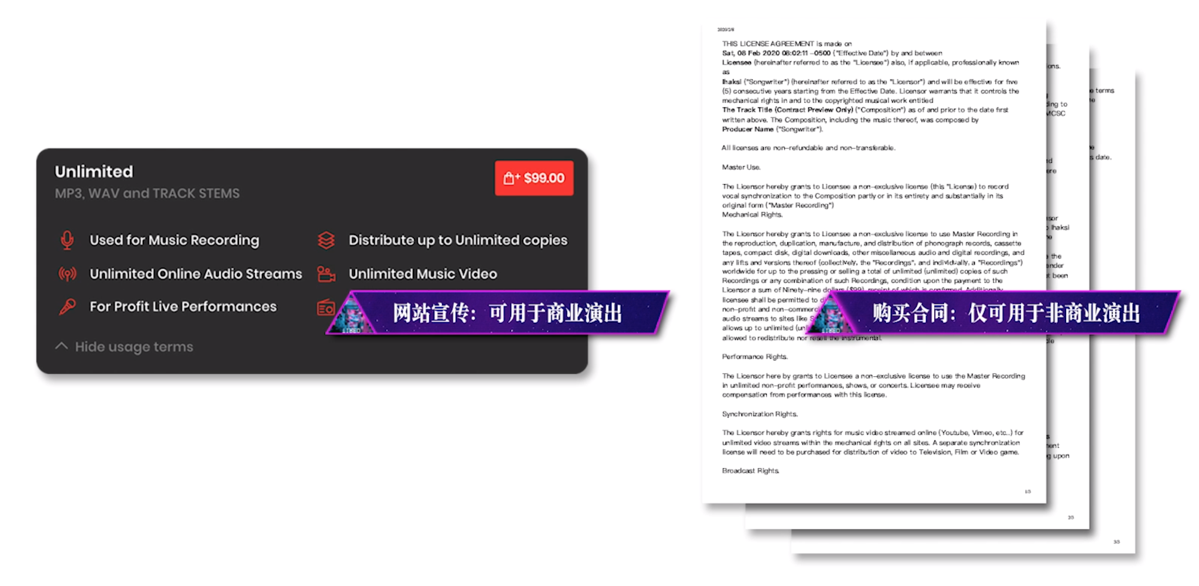 老舅曾委托朋友在2019年7月12日以99美元在BeatStars上购买了More Sun的“无限制”版本。Ihaksi在BeatStars上作品标有4个价位,权限也很清楚,99美元的“无限制”版本,与可议价的“独家”版本权限相同,可以用于音乐录制、视频制作、盈利演出等。但是歌曲的购买合同里,99美元版本包括的是非商业演出。这也就意味着网站在宣传上有图文不符的嫌疑,有可能构成误导或欺诈。